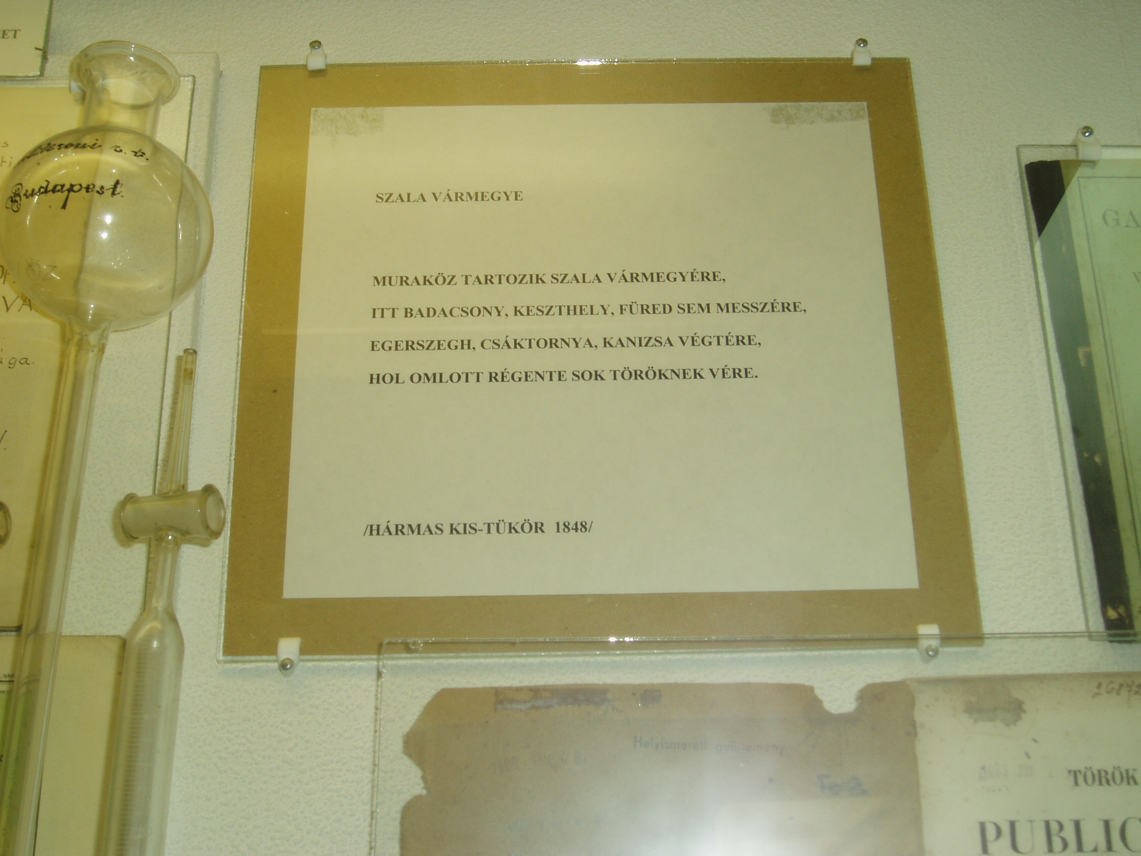 Nyilvános 1083 | 1778 | Tapolca: Templom domb 8. Múzeum | A múzeum épülete, az ún. Kántorház - a város védett építészeti emléke - Tapolca történelmi városközpontjában, a Malom-tó fölötti Templom dombon található. Ide járt elemi iskolába a város nagy szülötte, Batsányi János költő. Az épületben 1733-tól 1884-ig folyt az elemi iskolai oktatás. A múzeum iskolatörténeti kiállításán olvasható idézet, Zala vármegye verses összefoglalása a Hármas kis-tükör c. 1848-as tankönyvből. A felvétel 2007 februárjában készült. Felh. irod.: Látnivalók Veszprém megyében. Miskolc, Well-PRess, 2000 Hangodi László: Múltbanéző - kiállításvezető a Tapolcai Városi Múzeum tárlataihoz. Tapolca, 2006 |