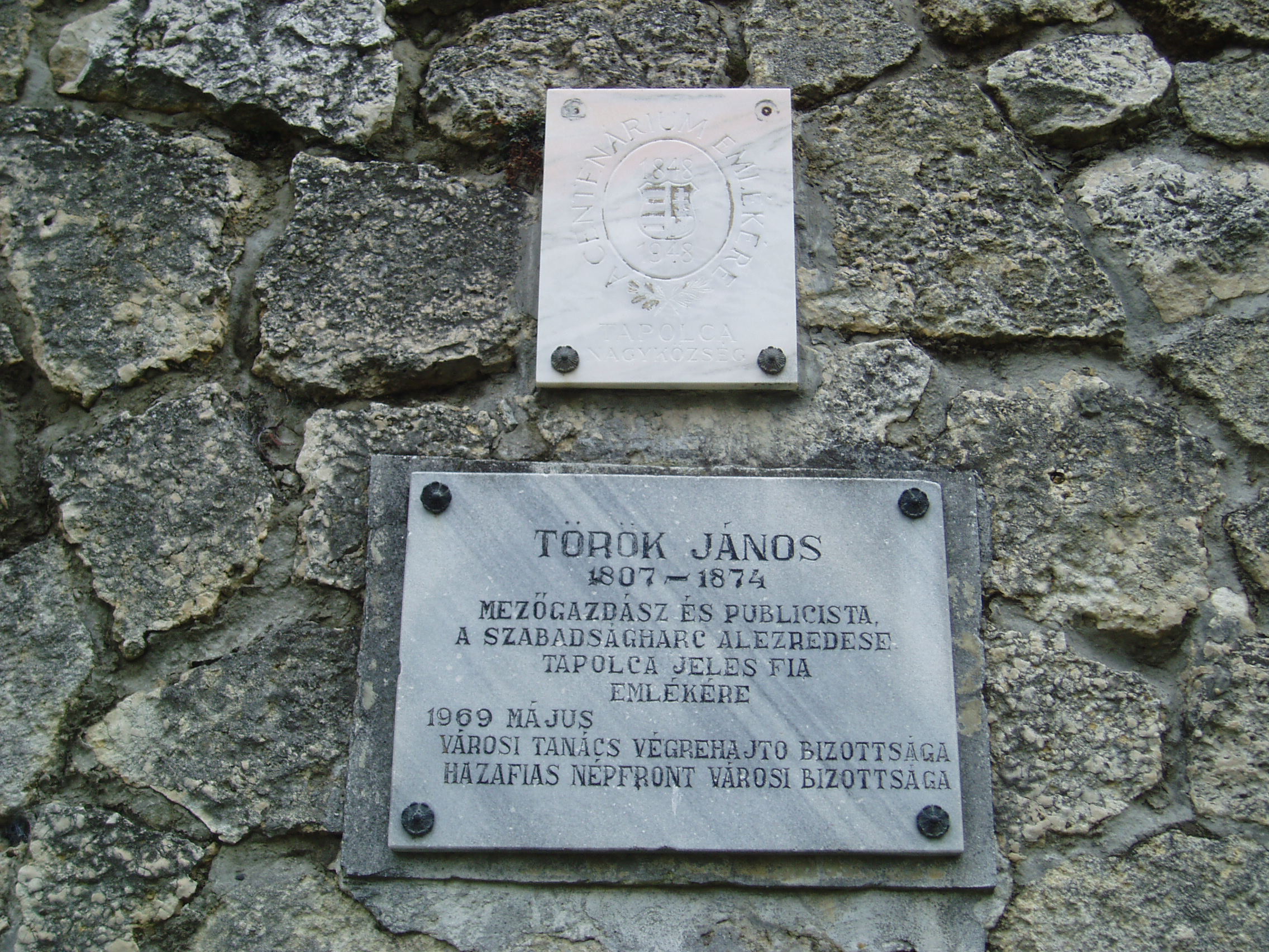 Nyilvános 1060 | 1659 | Tapolca, Városi Panteonfal: Török János emléktáblája | A Malom–tó mögött álló magas kőfal a Városi Panteonfal, amelyen több neves, tapolcai kötődésű személyiségnek állítottak emléktáblát. Török János (1807-1874) mezőgazdász és publicista, az 1848/49-es szabadságharc alezredese Tapolcán született. 1969-ben felavatott emléktáblája a testvére, Török Antóniusz Flórián emlékét őrző tábla mellett látható. A felvétel 2007 februárjában készült. Felh. irod.: Bándi László: Emlékhelyek Veszprém megyében. Veszprém, 1996 www.tapolca.hu |