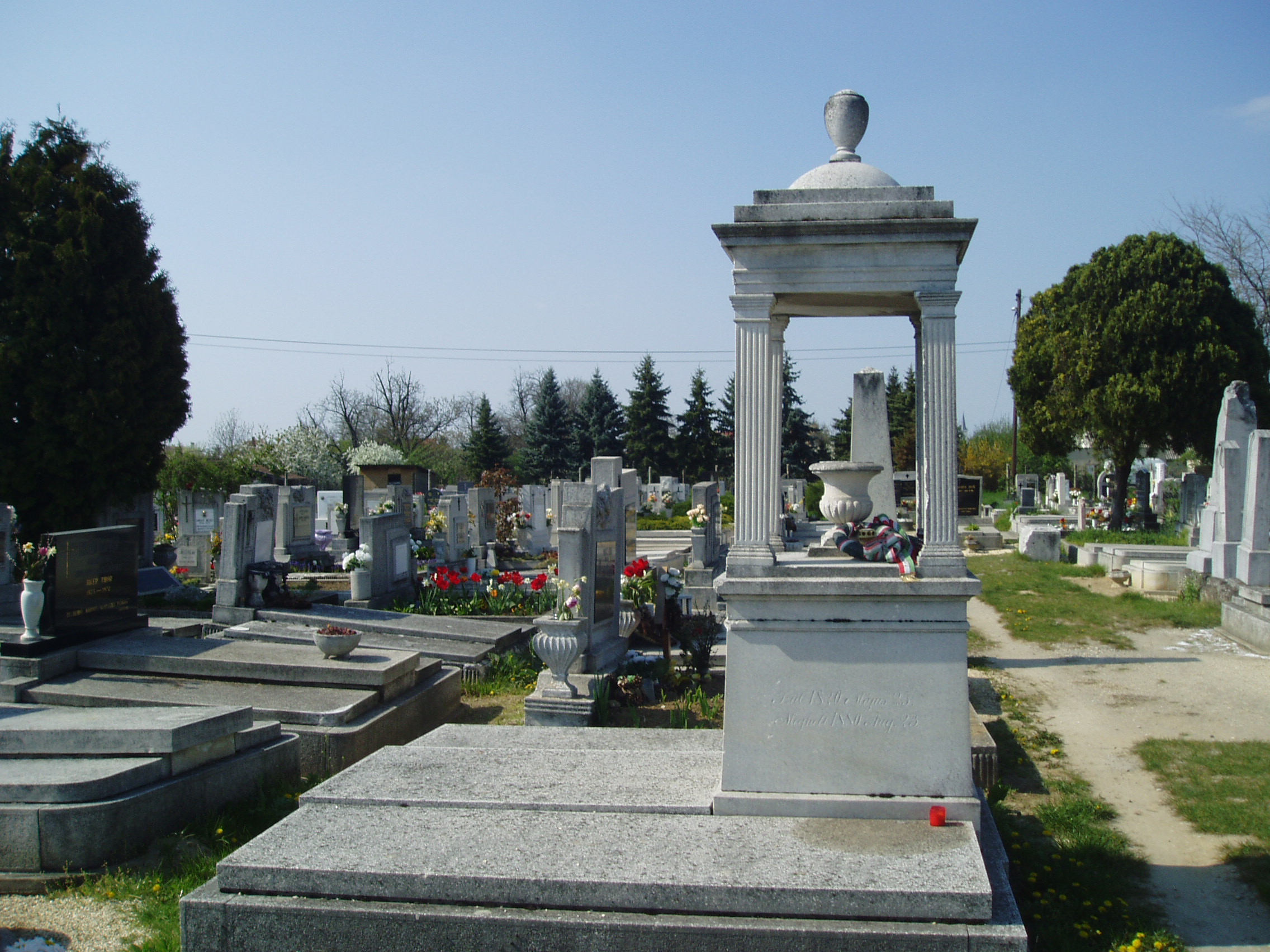 Nyilvános 1395 | 3734 | Pápa, Alsóvárosi temető: Bocsor István sírja | A Jókai utcáról nyíló Temető utca vezet a XIX. század elején megnyílt Alsóvárosi köztemetőbe. A város sok neves személyiségének van itt a sírja. Itt nyugszik Bocsor István (Enying, 1807. okt. 18. – Pápa, 1885. jún. 3.) író, tanár. Enyingi jobbágycsalád sarja. 1819-1832 között Pápán tanult, a református főiskolán teológiai és jogi képesítést nyert, majd 1837-től tanított. Magyar nyelvű történelemórái a város közönségére is nagy hatást gyakoroltak. 1848-ban az enyingi kerület nemzetgyűlési képviselője volt. A szabadságharc bukása után visszavonultan, tanári munkásságának élt. Alakját Kozma Andor: A karthágói harangok c. versében örökítette meg. Latin nyelvtana öt kiadást ért meg. Pápán a Széchenyi u. 10. sz. házon – ahol lakott – emléktáblája, a Dunántúli Ref. Egyházkerület Könyvtárában (Pápa, Március 15. tér 9.) mellszobra van. Radikalizmusáról tanúskodó, előadásait tartalmazó Világtörténelem (1841) című, illetve Középkori történetek (1863–1864.) című kézirata is ebben a gyűjteményben található. A fénykép 2007 áprilisában készült. Felh. irod.: Németh Adél - Szabó Lajos: Pápa. Bp. Panoráma, 1989 Veszprém megyei életrajzi lexikon. Veszprém, Veszprém Megyei Önkormányzat Közgyűlése, 1998 |