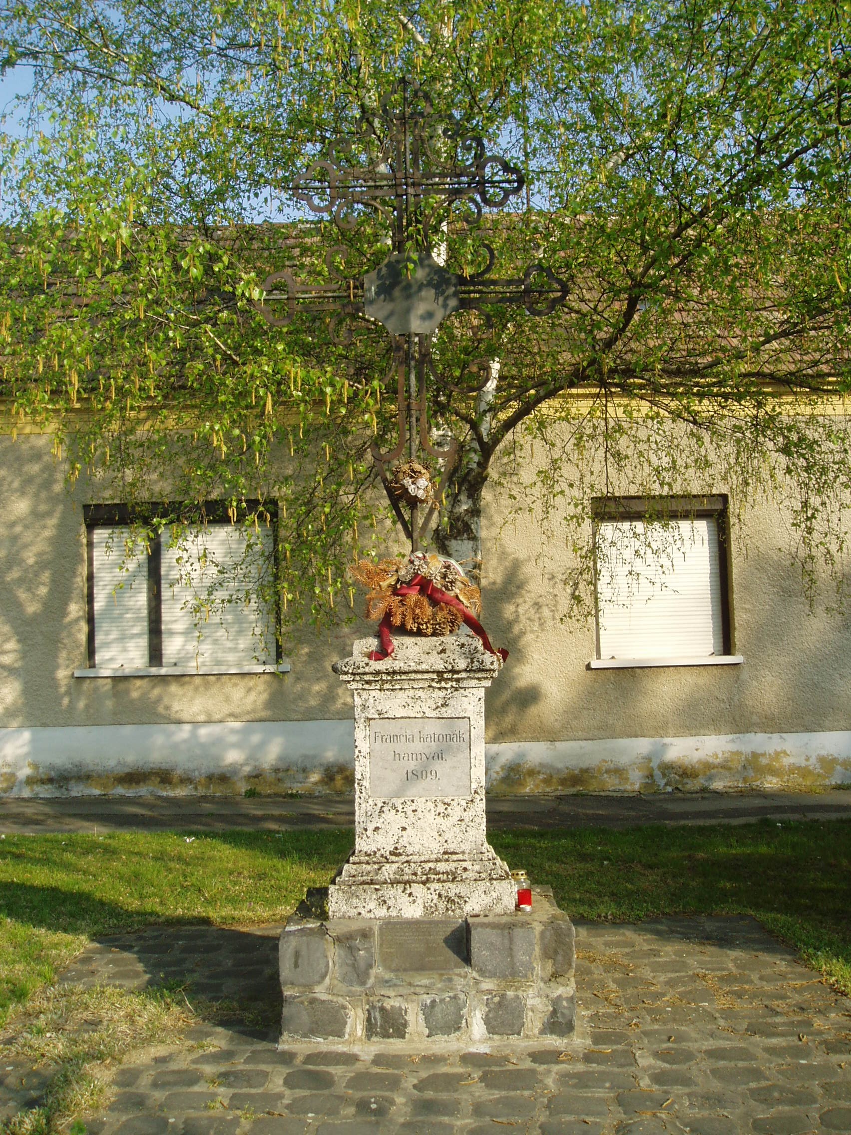 Nyilvános 1159 | 2086 | Pápa, Anna tér: Francia kereszt | Az Anna tér az egykori Alsóváros településközpontja. A tér dombján álló Szent Anna kápolna 1875-ben épült. A közelében található ún. Francia kereszt a napóleoni háború francia halottainak egykori tömegsírja felett áll. Pápát 1809. június 1. és július 6. között megszállva tartották a franciák. A hátrahagyott, majd később idehozott sebesültek ápolásáról a városnak és a megyének kellett gondoskodni. Egyes források szerint több, mint 5000 sebesültet ápoltak a városban, akik közül sokan belehaltak sérüléseikbe. Őket itt, az Anna téren temették el. Hamvaik a temető felszámolása után az Alsóvárosi temetőbe kerültek a kettős vaskereszttel együtt, amelyet 1986-ban állítottak vissza eredeti helyére. A fénykép 2007 áprilisában készült. Felh. irod.: Németh Adél - Szabó Lajos: Pápa. Bp. Panoráma, 1989 |