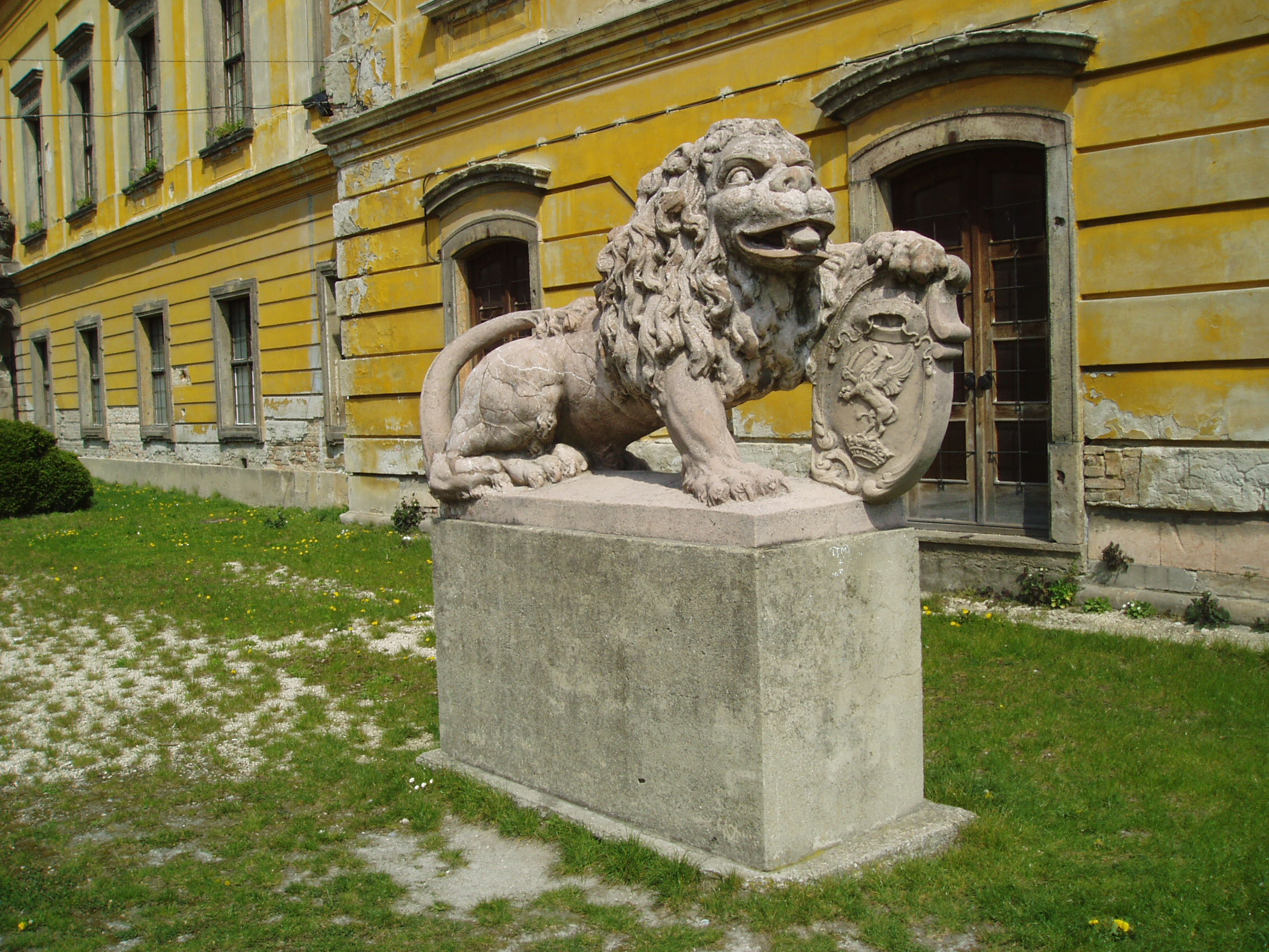 Nyilvános 1163 | 2159 | Pápa, Fő tér 1-3. Esterházy-kastély | A barokk kastély a korábban itt állott végvár helyére épült, részben annak alapfalai, kövei felhasználásával. A régi várat az 1740-es évektől Esterházy Ferenc (1683–1754) tárnokmester kezdte átalakítani Franz Anton Pilgram tervei alapján. A barokk várkastély kialakítása 1784-re fejeződött be Esterházy Ferenc fia, Eszterházy Károly egri püspök idejében Fellner Jakab, majd Grossmann József vezetésével. Az U alakú, egyemeletes épület a versailles-i palota nyomán elterjedt francia kastélytípus képviselője. A képen a díszudvar bejáratánál elhelyezett két kőoroszlán egyike látható, amely az Esterházyak címerpajzsát tartja. Az oroszlánok 1945-ig a kastélyt övező kerítés díszes kovácsoltvas kapuját őrizték. A fénykép 2007 áprilisában készült. Felh. irod.: Németh Adél - Szabó Lajos: Pápa. Bp. Panoráma, 1989 Pápa. Szerk. Sz. Farkas Aranka. Bp., Magyar Képek, 2000 |
