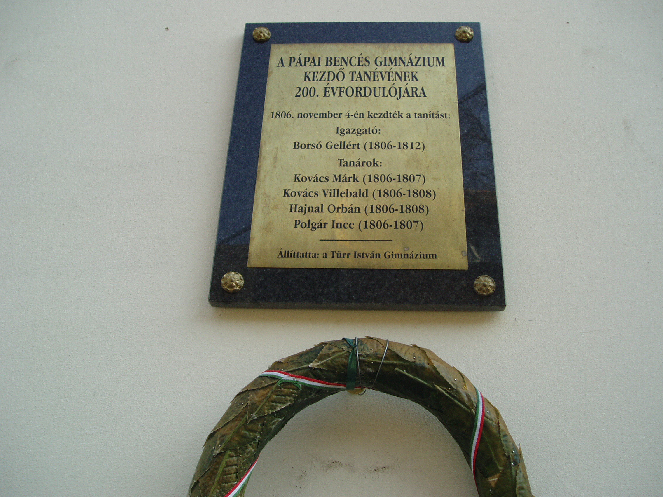 Nyilvános 1086 | 1622 | Pápa, Fő utca 10. Bencés templom | Eredetileg a pálosok számára épült 1737-1742 között a korábban itt állott templom helyére. Építtetője, Acsády Ádám püspök szentelte fel. A pálos rend eltörlése után, 1806-ban kapták meg a bencések, akik ugyanebben az évben átvették és rendkívül magas szintre fejlesztették a pálosok korábbi iskoláját. A képen a bencés gimnázium 200. évfordulója alkalmából elhelyezett emléktábla látható az első tanári kar névsorával. A fénykép 2007 áprilisában készült. Felh. irod.: Németh Adél - Szabó Lajos: Pápa. Bp. Panoráma, 1989 |