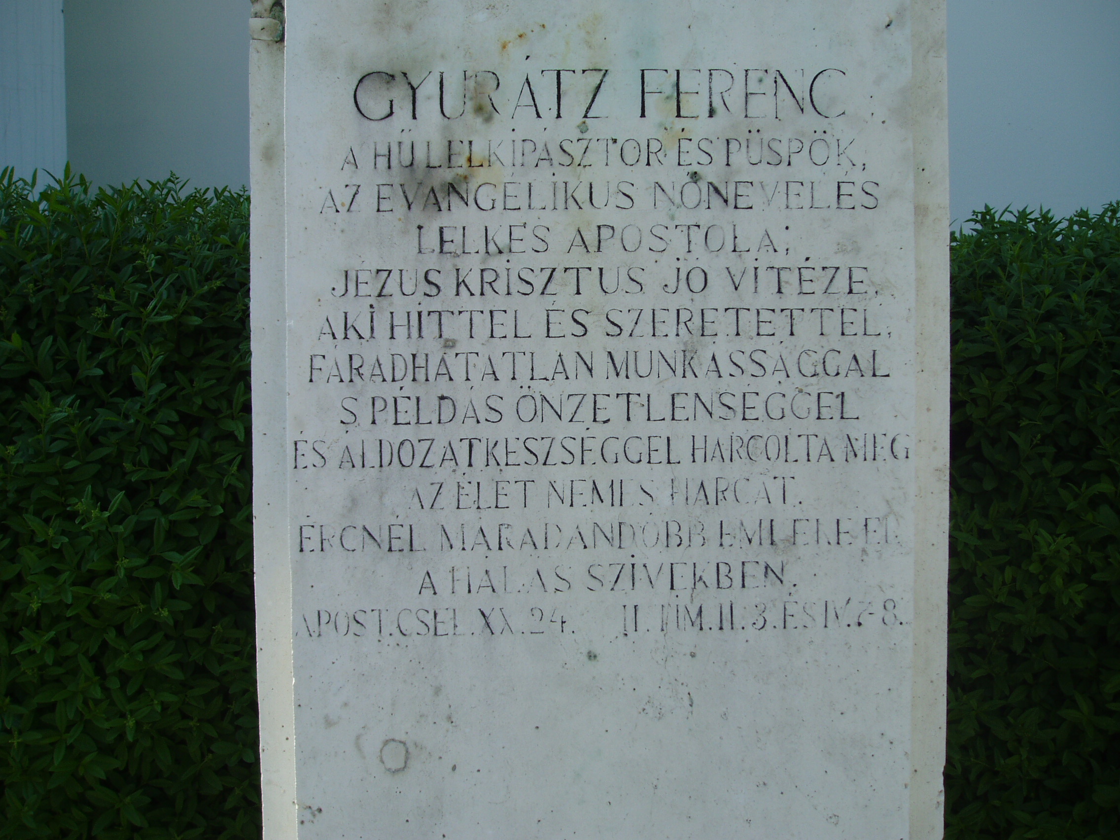 Nyilvános 1114 | 1837 | Gyurácz Ferenc utca 1. Gyurátz Ferenc püspök szobra | Az evangélikus templom udvarán áll Gyurátz Ferenc négyzetes hasábon nyugvó mellszobra, amelyet Lux Elek szobrászművész készített 1932-ben. Gyurátz Ferenc (1841-1925) pápai lelkész volt, majd 1895-1916 között a dunántúli evangélikus egyházkerület püspöke. Példamutató egyházi tevékenysége mellett részt vett a város közigazgatásában és kulturális életében. Pápán az evangélikus templom utcáját róla nevezték el. Kőszegen az általa alapított leánynevelő intézet illetve tanítóképző viseli a nevét. A fénykép 2007 áprilisában készült. Felh. irod.: Németh Adél - Szabó Lajos: Pápa. Bp. Panoráma, 1989 |