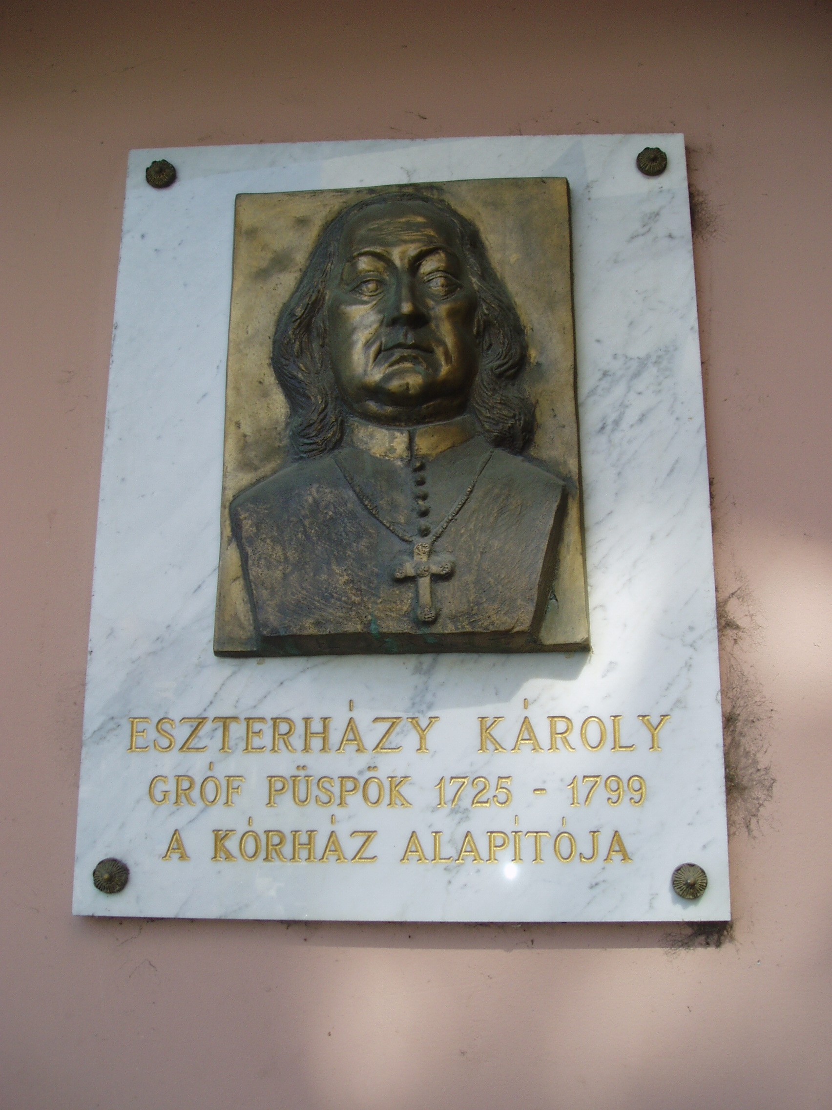 Nyilvános 1155 | 1922 | Pápa, Jókai utca 9. | A kórház közelmúltban átadott új épületén - a régi épület szomszédságában - gróf Eszterházy Károly (1725-1799) portrédomborműves emléktáblája látható. Pápán a kórházi ápolás bevezetése az Esterházy Ferenc által 1730 körül betelepített Irgalmas rend nevéhez fűződik. Pápa városi kórházát 1757-ben alapította Esterházy Károly - akkor váci, majd egri püspök -, Pápa ura. A szomszédos épület (lásd: Pápa, Jókai u. 7.) az ő adományából épült Fellner Jakab vezetésével. A fénykép 2007 áprilisában készült. Felh. irod.: Németh Adél - Szabó Lajos: Pápa. Bp. Panoráma, 1989 Veszprém megyei életrajzi lexikon. Veszprém, Veszprém Megyei Önkormányzat Közgyűlése, 1998 |
