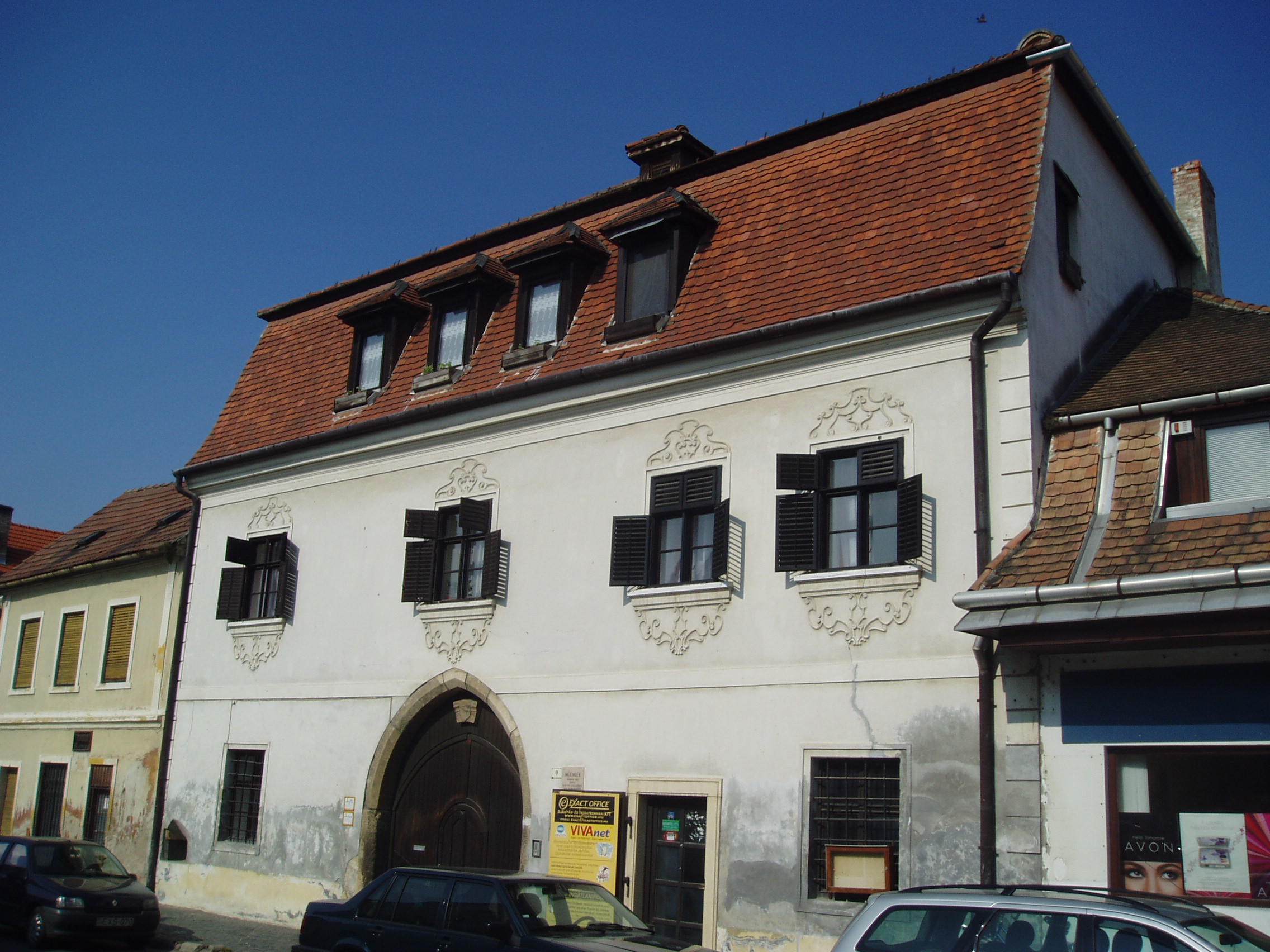 Nyilvános 1086 | 2578 | Pápa, Korvin utca 9. | Az ún. Korvin-házat egy időben Mátyás király vadászházának is nevezték. Tulajdonosául pedig a Gutkeled nemzetségbeli Marczaltői Miklóst és fiát tételezték fel, akik a király szolgálatában álltak. Abban az időben ugyanis Pápa a Bakony erdőségeinek szélén feküdt. A ház elnevezését a másodlagos elhelyezésű, kapu feletti zárókő (lásd: 2.kép) faragott címeréről kapta. A címeren látható, csőrében köves gyűrűt tartó madarat összetévesztették Mátyás címerállatával, a gyűrűs hollóval. A címer azonban a Ráskai családé, akik a Gutkeled nemzetségből származtatták magukat. Az épület XVI. századi bizonyatható tulajdonosa, építtetője a Tahy család. De, hogy nekik volt-e, és milyen kapcsolata a Ráskai családdal, még nem tisztázott. A házat vagy Tahy János auránai prior, vagy testvére, Ferenc, Stubnica várának ura építtette. Tahy Ferenc sírkövén ugyanis az ezen a házon láthatóhoz teljesen hasonló címer található. Ezt a feltevést igazolja a Korvin-ház kapuboltozatának három gyámkövén látható címerpajzs az 1515-ös évszámmal. A reneszánsz stílusú, egyemeletes, manzárdtetős épület rendkívül szép arányú. Utcai homlokzata egyszerű övpárkánnyal tagolt, ablakai szalagkeretezésűek. Kapuszerkezete még az 1500-as évekből való, az épület udvari homlokzata azonban már nem őrzi az eredeti stílusjegyeket. A fénykép 2007 áprilisában készült. Felh. irod.: Németh Adél - Szabó János: Pápa. Bp. Panoráma, 1989 |