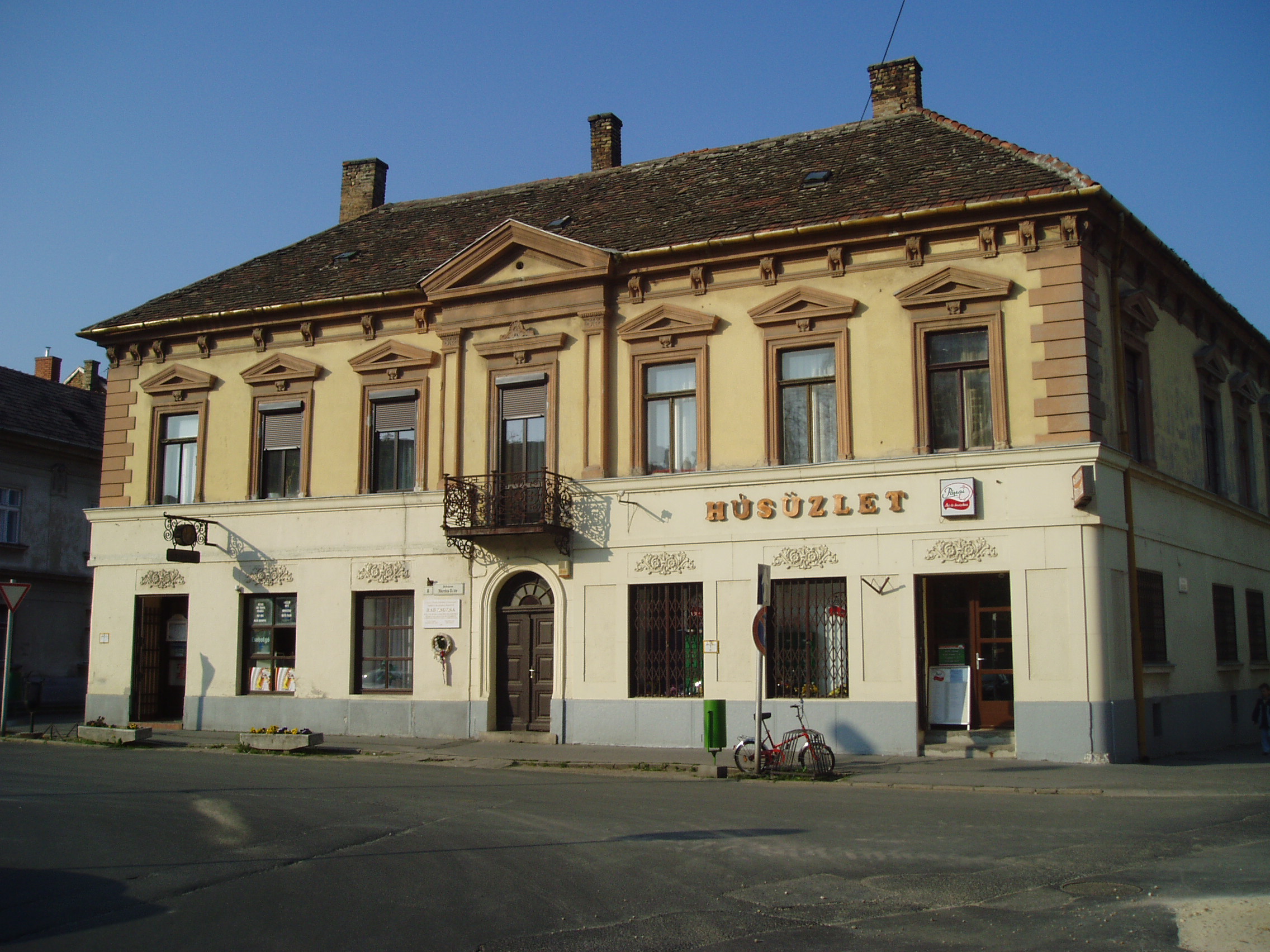 Nyilvános 1082 | 1770 | Pápa, Március 15. tér 8. | Az emeletes saroklakóház 1870 körül épült. Ebben a házban született 1923. július 3-án Rab Zsuzsa költő, műfordító. Édesapja, Rab István 1886-1957) a második világháborút megelőző időszakban a Pápai Református Kollégium Gimnáziumának (lásd: Pápa, Március 15. tér 9.) legendás hírű igazgatója, édesanyja a pápai templomépítő–gondnok, Jilek Ferenc lánya. Tanulmányait szülővárosában kezdte, majd 1944–ben a Kecskeméti Református Nőnevelő Intézetben érettségizett. A budapesti egyetem orvostudományi szakára iratkozott be, majd egy év elteltével a bölcsészkar orosz szakos hallgatója lett. A nyelvek, az irodalmak szépségével édesapja ismertette meg. Bizonyára nagy része volt abban, hogy a fiatal kamaszlány 16 éves korában saját verseskötetben tárta fel diáktársainak a szerelemről, otthonról, költészetről fogant lírai impresszióit. A fény felé című kötetet 17 évig nem követhette másik. A második világháború után megváltozott rendszerben Rab Zsuzsa egyetemi tanulmányaihoz állami támogatást nem kaphatott. Édesapját nyugdíj nélkül bocsájtották el, a családot osztályidegennek nyilvánították. Egyetemistaként takarításból, kisebb diákok tanításából, alkalmi munkákból élt. Tehetségének és kitartó szorgalmának köszönhetően 1955–ben robbanásszerűen tört be a műfordítás–irodalomba a magyar nyelven addig ismeretlen Szergej Jeszenyin verseinek fordításával. Ezután sorra jelentek meg műfordításai. Hihetetlenül gazdag életművet szakított félbe a halál 1998. március 5-én. Rab Zsuzsa szeretett iskolájára hagyta könyvtárának jelentős hányadát (a Petőfi u. 13. számú épületben, az ún. Ókollégiumban található), vagyonának egy részéből pedig létrehozta a Rab István Alapítványt, amellyel a latinban jeleskedő ifjakat kívánta támogatni. A fénykép 2007 áprilisában készült. Felh. irod.: Németh Adél - Szabó Lajos: Pápa. Bp. Panoráma, 1989 Rab Zsuzsa. = Olvadás. A Pápai Református Gimnázium diáklapja. 2003. 8. |
