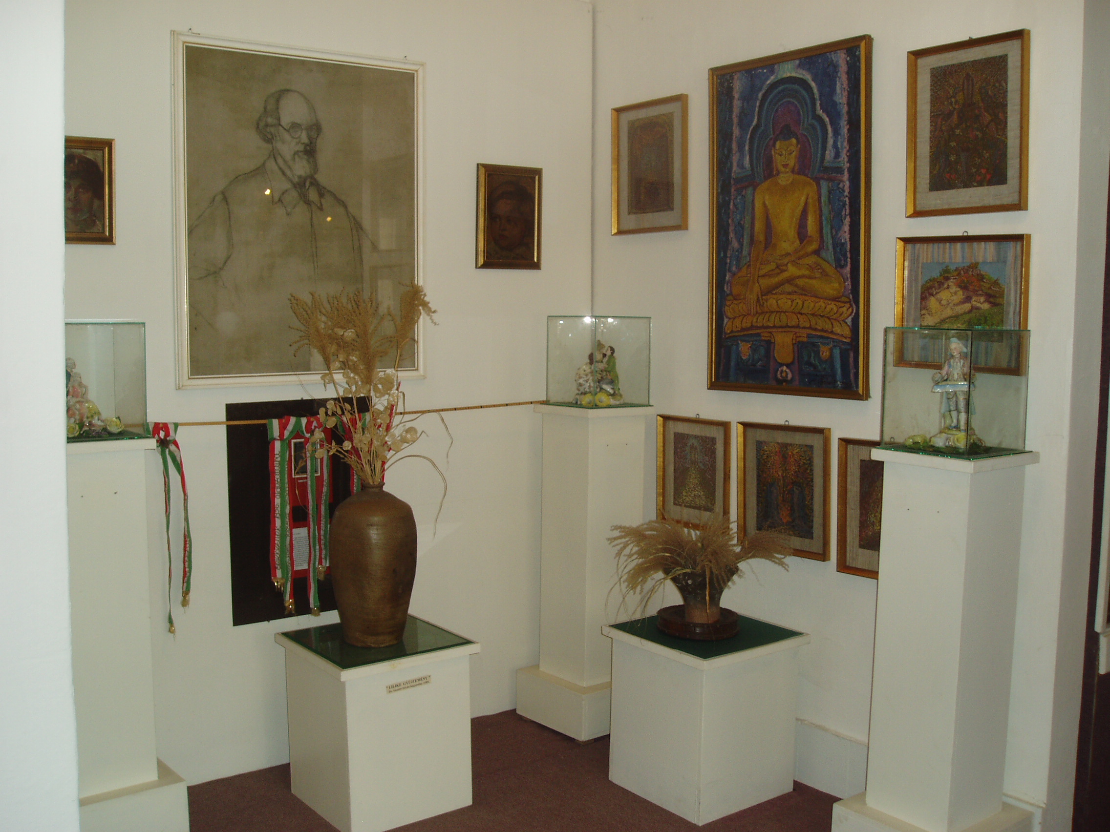 Nyilvános 1080 | 1712 | Sümeg, Kisfaludy tér 2. Városi Múzeum, Sass Brunner-emlékszoba | A Városi Múzeum ad otthont a Sass Brunner emlékkiállításnak is, amely Sass Brunner Ferenc, felesége, Sass Brunner Erzsébet és leányuk, Brunner Erzsébet festészeti munkáit mutatja be. Sass Brunner Ferenc az első világháború után telepedett le Sümegen (lásd még: Sümeg, Szent István tér 3., Sümeg, Temető). Nagykanizsai származású felesége és lánya 1928-ban Indiába utaztak és ott éltek életük végéig. Munkásságuk mára joggal bevonult a XX. század indiai festészetének klasszikusai közé. A kiállítás képanyaga jórészt Elizabeth Brunner adományaként került a múzeum tulajdonába. A művészektől a nagykanizsai Művészetek háza ("kiskastély") is őriz festményeket. A fénykép 2007 júniusában készült. Felh. irod.: Sümegi kalauz. Sümeg, Sümegi Fórum Alapítvány, 1993 |