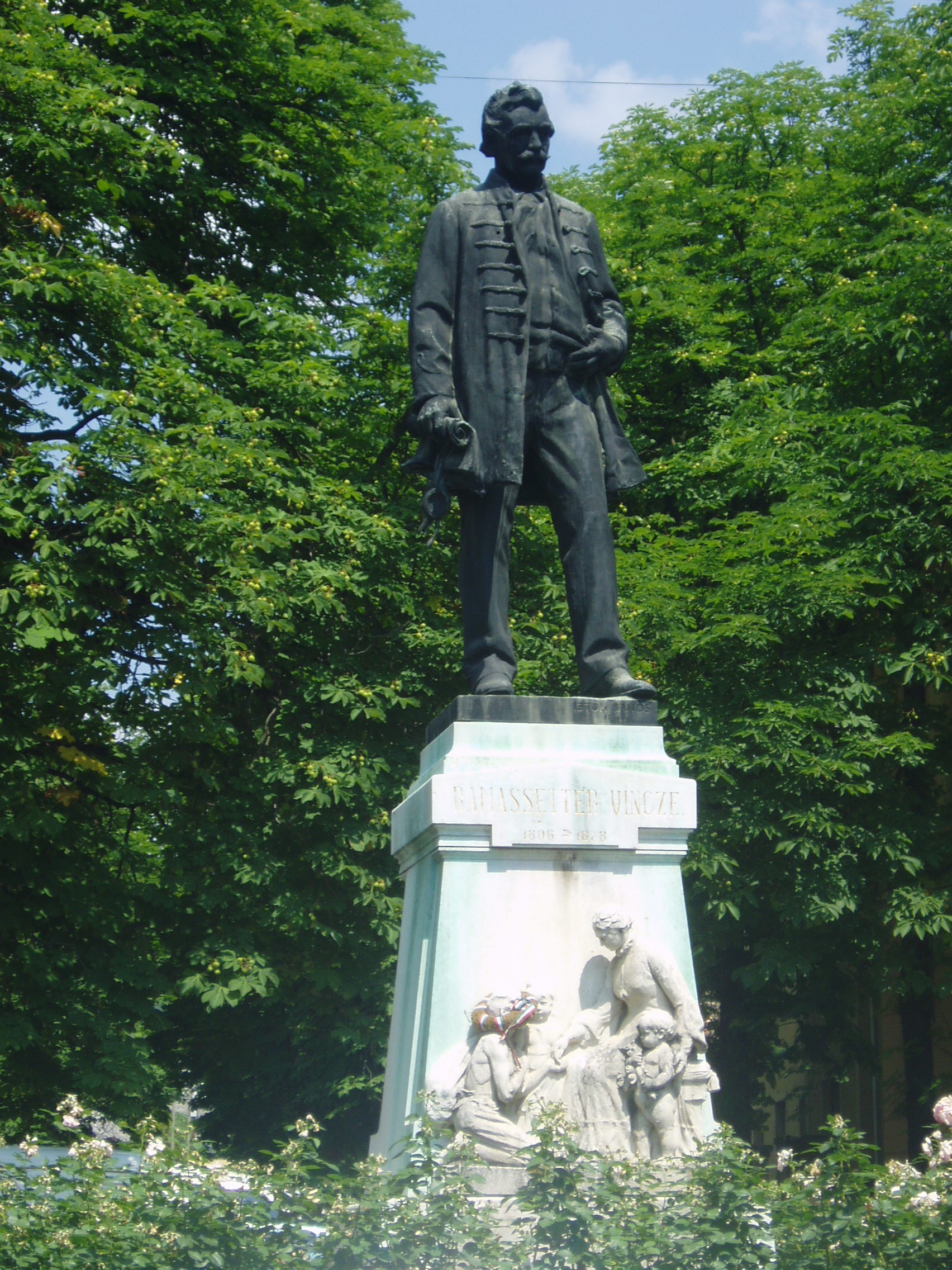 Nyilvános 1050 | 1787 | Sümeg, Kossuth utca 13. Ramssetter Vince szobra | Sümeg legforgalmasabb pontján, a Kisfaludy szálloda és a Kisfaludy Gimnázium (lásd: Sümeg, Mártirok útja 1.) között 1908-ban állították fel Sümeg nagy fiának, a város jótevőjének, Ramassetter Vincének egészalakos szobrát, Istók János alkotását. Ramassetter Vince (Sümeg, 1806-Sümeg, 1878) Kőszegen és Győrött járt iskolába, majd folytatva a Németalföldről betelepült apja mesterségét, ő is kékfestő lett. Később áttért a szőlőtermesztésre és a borkereskedelemre, amelyhez kádárműhelyt tartott fenn. 1848-ban Sümeg polgármesterévé választották. 1846-ban az iparostanoncok oktatására, 1855-ben pedig egy reáliskola támogatására hozott létre alapítványt. Vagyona nagyobb részét Sümeg városára, az oktatási és az egészségügyi intézmények fenntartására hagyta. A városban több emléktáblája is van (lásd: Sümeg, Árpád u. 5., Deák F. u. 8., Mártirok u. 1., Panteonfal, Ramassetter u. 10.). Sírja a helyi köztemetőben található (lásd: Sümeg, Temető), utca is őrzi nevét. A szobor talapzatán lévő dombormű feleségét, Kompanik Zsófiát ábrázolja, aki jótékonysági, városfejlesztő tevékenységében méltó társa volt férjének. Róla nevezték el a kórház utcáját. A fénykép 2007 júniusában készült. Felh. irod.: Koppány Tibor - Kozák Károly: Sümeg útikalauz. Veszprém, Idegenforgalmi Hivatal, 1965 Látnivalók Veszprém megyében. Miskolc, Well-PRess, 2004 Sümegi kalauz. Sümeg, Sümegi Fórum alapítvány, 1993 |