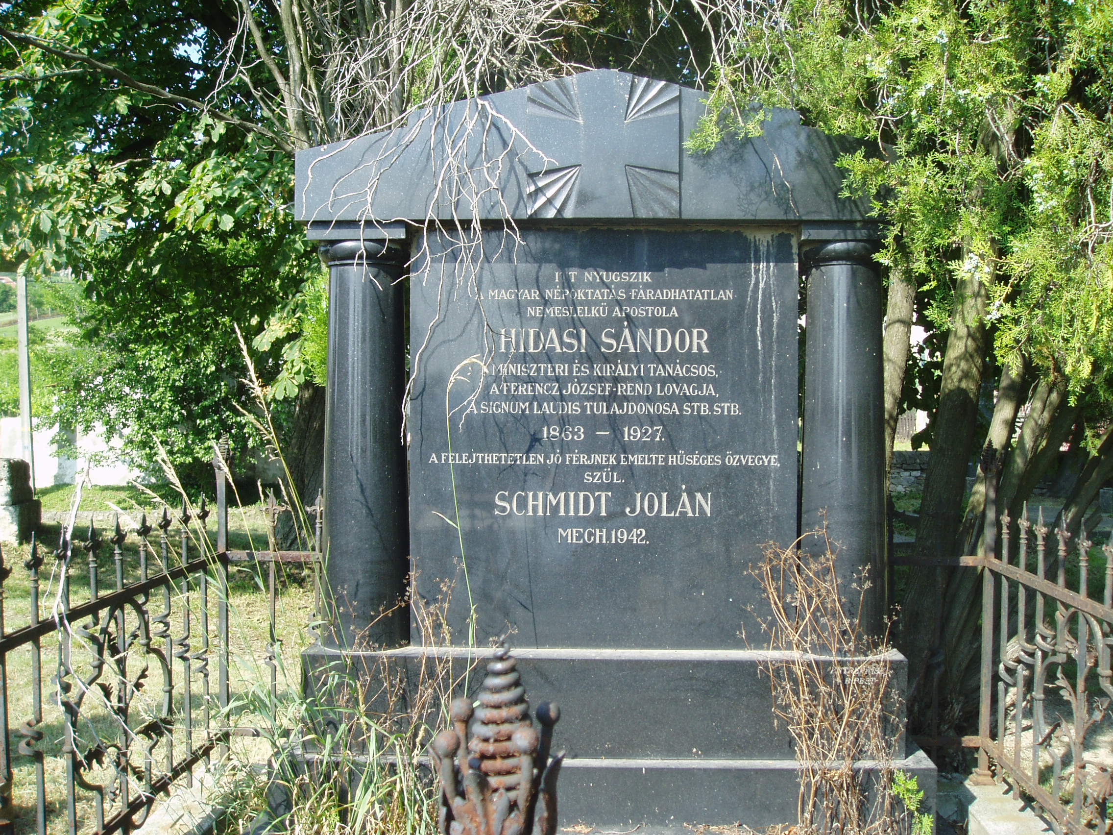 Nyilvános 1066 | 1770 | Sümeg, Temető. Hidasi Sándor sírja | Sümeg délkeleti határában, a Tapolcára vezető út mellett emelkedő lankás domboldalon találjuk a város köztemetőjét. Helyét még Bíró Márton püspök jelölte ki; jelentősebb számban a XIX. század eleje óta kezdtek ide temetkezni. A temetődomb tetején áll az 1816-ban épített, későbarokk stílusú temetőkápolna. Körülötte a sümegi élet utolsó két évszázada szinte valamennyi híres személyiségének sírja fellelhető. Itt nyugszik Hidasi Sándor (1863-1927), a magyar népoktatás jeles alakja, királyi tanácsos. A fénykép 2007 júniusában készült. Felh. irod.: Koppány Tibor - Kozák Károly: Sümeg útikalauz. Veszprém, Idegenforgalmi Hivatal, 1965 Sümegi kalauz. Sümeg, Sümegi Fórum Alapítvány, 1993 Miklósi-Sikes Csaba: Kőbe vésett történelem. A sümegi városi temetők története és sírjelei 1950-ig. Sümeg, Sümegi Fórum Alapítvány, 2002 Veszprém megyei életrajzi lexikon. Veszprém, Veszprém Megyei Önkormányzat Közgyűlése, 1998 |