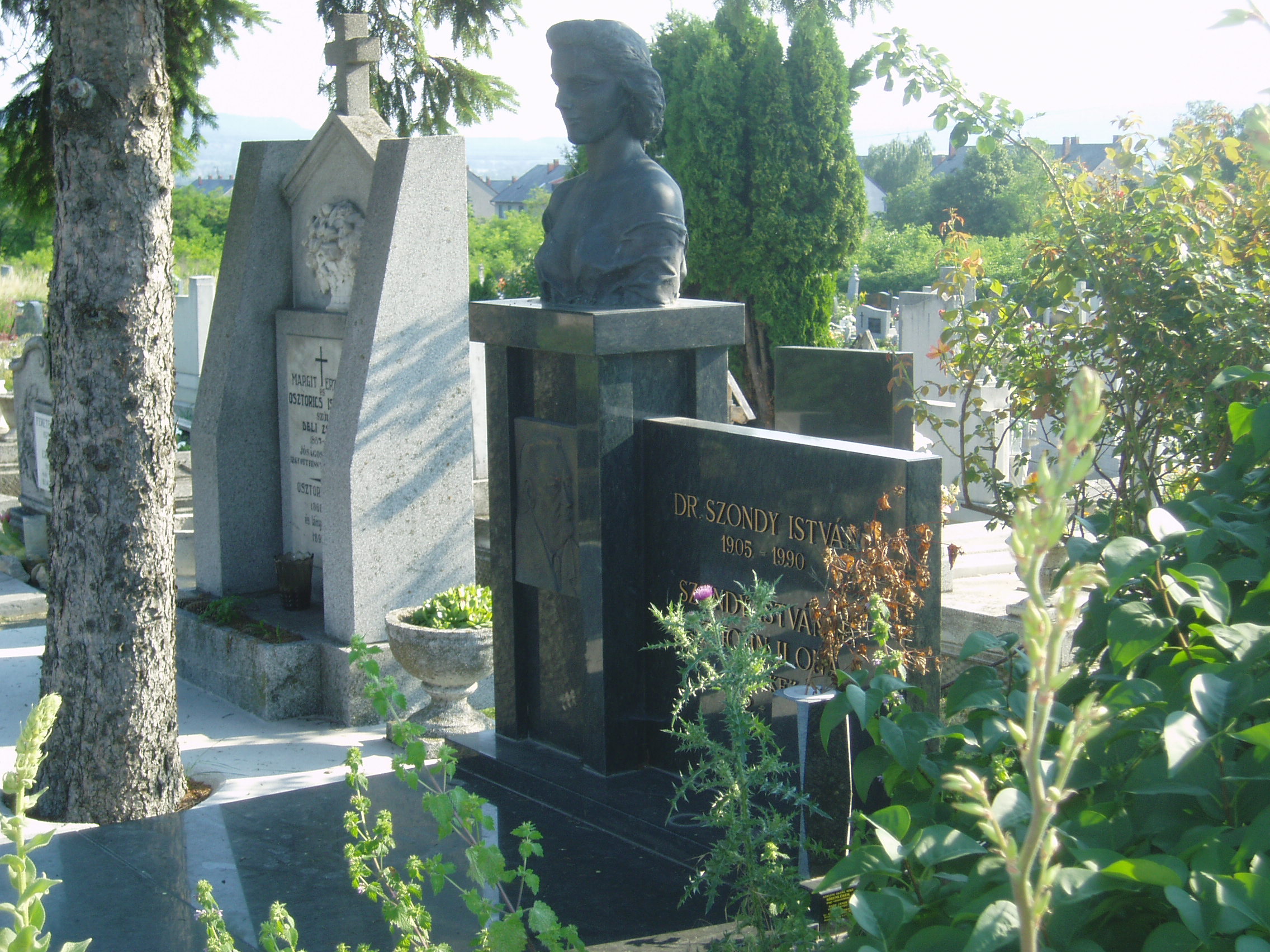 Nyilvános 1053 | 1886 | Sümeg, Temető. Szondy Istvánné "Lilike" sírja | Sümeg délkeleti határában, a Tapolcára vezető út mellett emelkedő lankás domboldalon találjuk a város köztemetőjét. Helyét még Bíró Márton püspök jelölte ki; jelentősebb számban a XIX. század eleje óta kezdtek ide temetkezni. A temetődomb tetején áll az 1816-ban épített, későbarokk stílusú temetőkápolna. Körülötte a sümegi élet utolsó két évszázada szinte valamennyi híres személyiségének sírja fellelhető. A Ferences rend sírkertjének nagy homokkő-keresztje közelében nyugszik Szondy István orvos és felesége, az 1987-ben elhunyt John Ilona, azaz Lilike. Lilike gazdag műgyűjteményt hozott létre, amelyet előbb saját házukban állítottak ki (lásd: Váralja u. 6.), majd az anyag a Kisfaludy Sándor Múzeumba került, ahol egy külön emlékszobában tekinthetők meg legértékesebb darabjai (lásd: Kisfaludy tér 2.). A fénykép 2007 júniusában készült. Felh. irod.: Koppány Tibor - Kozák Károly: Sümeg útikalauz. Veszprém, Idegenforgalmi Hivatal, 1965 Sümegi kalauz. Sümeg, Sümegi Fórum Alapítvány, 1993 Miklósi-Sikes Csaba: Kőbe vésett történelem. A sümegi városi temetők története és sírjelei 1950-ig. Sümeg, Sümegi Fórum Alapítvány, 2002 Veszprém megyei életrajzi lexikon. Veszprém, Veszprém Megyei Önkormányzat Közgyűlése, 1998 |