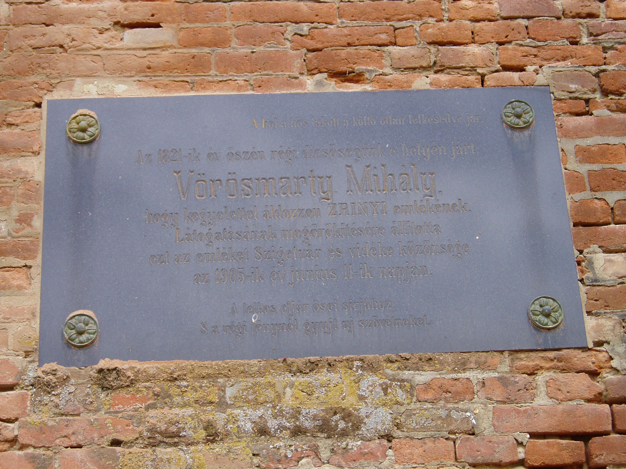 Nyilvános 1170 | 1827 | Szigetvár, Vár: Vörösmarty Mihály emléktáblája | A várban 1905-ben avatták fel Vörösmarty Mihály emléktábláját. A nagy magyar költő itt járt - az emléktábla felirata szerint - 1824 őszén, hogy kegyelettel adózzon Zrínyi Miklós történelmi tette előtt. Szigetvár című versét 1822-ben írta; lehet, hogy az emléktáblán nem pontos az évszám, vagy többször is járt ezen a helyen. Vörösmarty Mihály: Szigetvár Láttam veszélyes tájadat, oh Sziget! Előttem állott roskadozó falad, Előttem a múlt kor csatái S gyászba borúlt ege Hunniának. Itt késve mérgét nyelte az agg török; Itt táboroztak népei dölyfösen, Ott fenn erős, de számra kisded, S győzve fogyó hadaink tanyáztak. S onnan, ha kellett; mint az egek nyila A záporoknak vad zuhanási közt, Csattogva, sujtva, száz halálban Törtek alá rabölő haraggal. Kétszázezerrel víva meg egy marok Népség s vitái győztösek annyiszor, De ah! – borúlj el gyászhozó nap! – A diadal közepett enyésztek. Vagy mely tünő fény leng szemeim felé? A csendes éjnek rémi talán? – Vagy a Fagyos halálnak váza, vagy bús Képe az ősi idők fiának? Oh Zrínyi roncsolt képe, te vagy! Dicső Hős hajdan a vérfergetegek között, Rémítve villogsz most előmbe Századaink sanyarú korából: Duló vasat tart rettenetes karod, Elszánt komolyság terjedez arcodon, Lelkedben a szép hír, boszúság És kitörő harag ég szivedben. Mert vesztegelnek társaid a mezőn, Csatátlanul, rosz, gyáva tanács miatt, Míg téged a veszélyek útán Sírba viszen csapodár szerencse. Te a hazáért halni tudál; dicső! Mi nem tudunk már érte csak élni is; A támadó nap tudja, látja, A szomorún nyugovó, bününket. Mikor szününk meg bor, szerelem között A hon virultát messze felejteni? Mikor kerülhet vissza a künn Elpazarolt arany és dicsőség? Hajh elközelget majd az enyészet így! Eltörli a nép bajnoki tetteit: Megdőlnek a fajult vitézek, Sírjai hős eleik nevének. Börzsöny, 1822 A fénykép 2005 júniusában készült. |