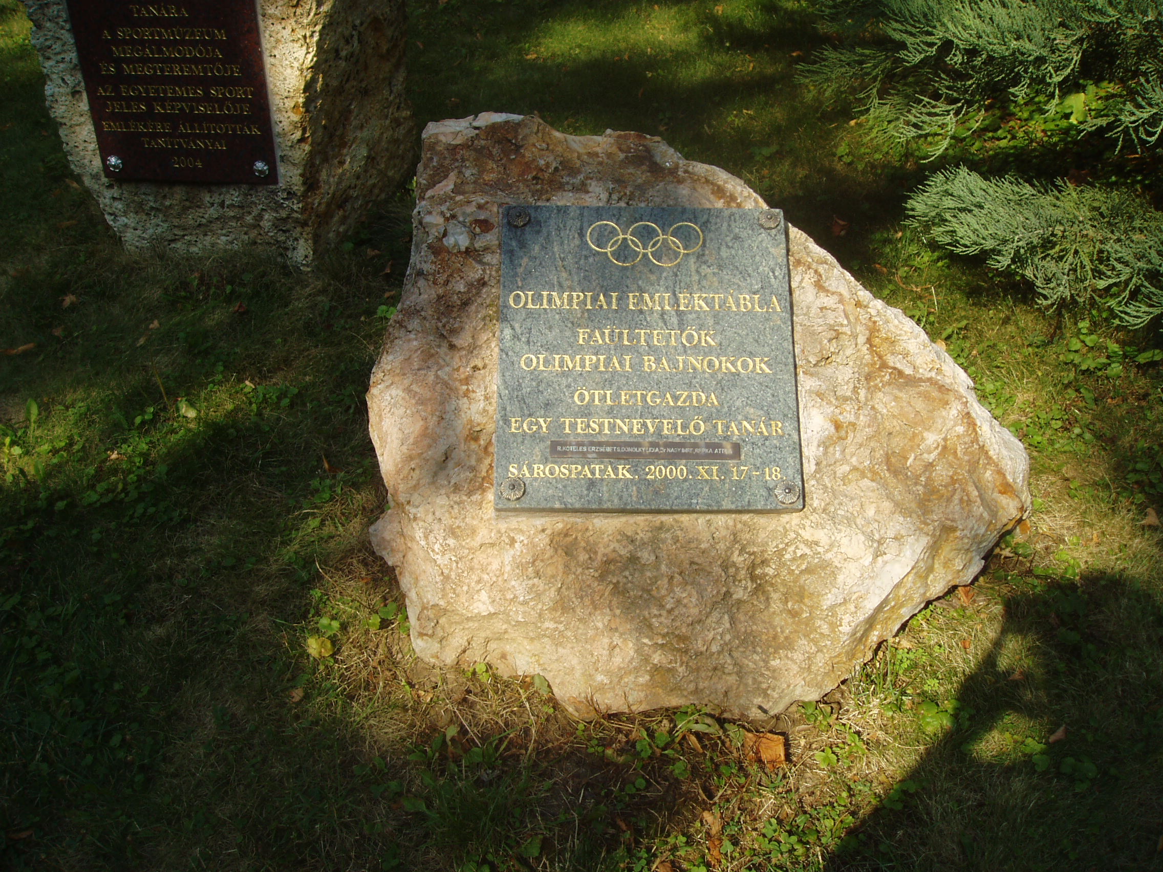 Nyilvános 1043 | 1661 | Sárospatak, Iskolakert: A pataki diákok emlékezete | A Református Kollégium (lásd: Sárospatak, Rákóczi u. 1.) bejáratával szemben találjuk az Iskolakertnek nevezett parkot. Az 1980-as években természetvédelmi területté nyilvánított Iskolakert sajátos nemzeti érték, mely egyedülálló az országban. Sétányai mentén Patakhoz kötődő jeles személyiségek szobrai állnak. Az iskolakertben álló műemlék tornacsarnok közelében is elhelyeztek néhány feliratos emlékkövet. A képen a 2000-ben felállított Olimpiai emléktábla látható. A fénykép 2007 augusztusában készült. Felh. irod.: Látnivalók Borsod-Abaúj-Zemplén megyében. Miskolc, Well-PRess, 1995 |