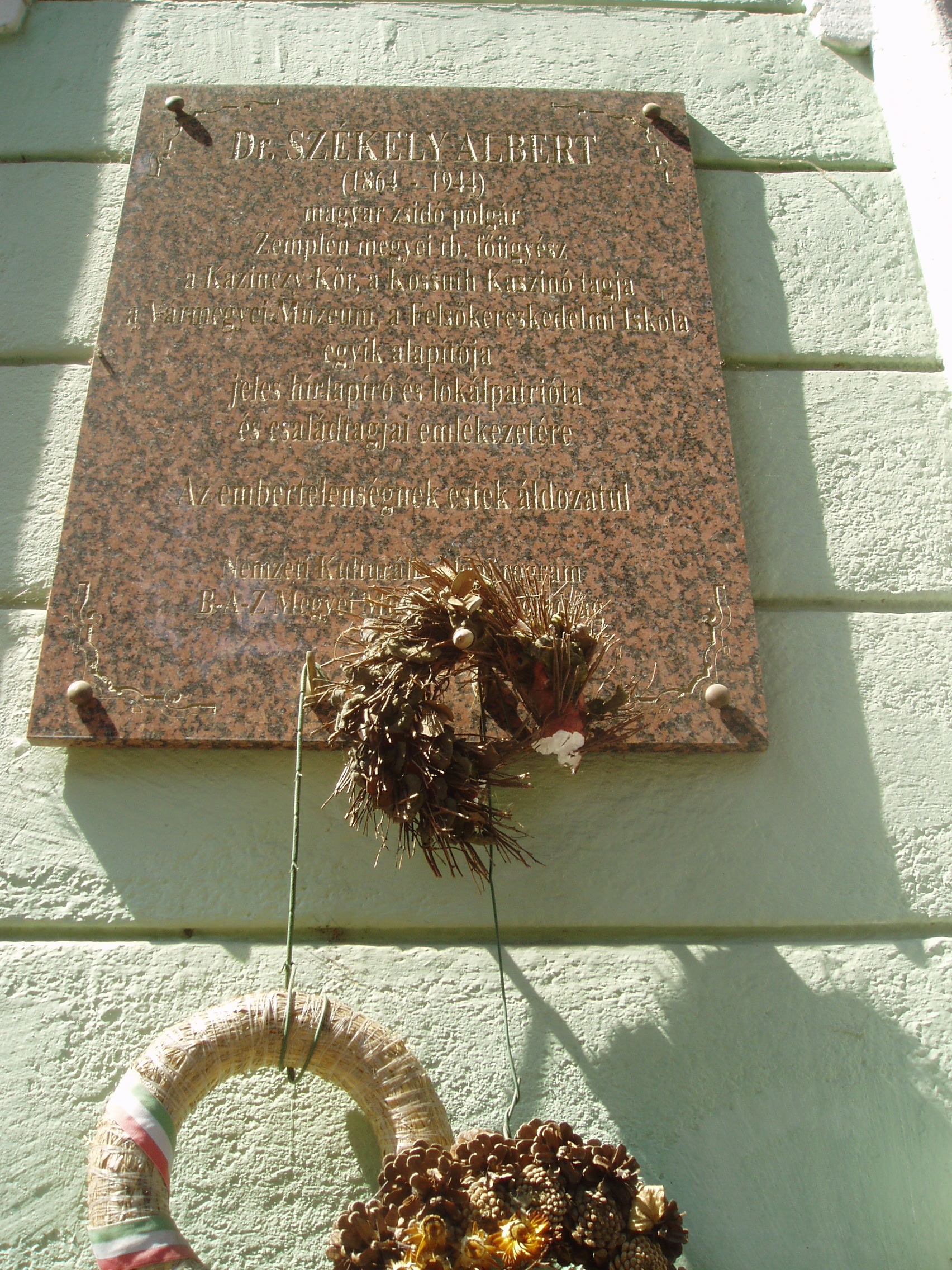 Nyilvános 1030 | 1453 | Sátoraljaújhely, Kazinczy utca 33. | A Városi Ügyészség épületén a közelmúltban helyezték el dr. Székely Albert emléktábláját: "Dr. Székely Albert (1864-1944) magyar zsidó polgár, zemplén megyei tb. főügyész, a Kazinczy Kör, a Kossuth Kaszinó tagja, a Vármegyei Múzeum, a Felsőkereskedelmi Iskola egyik alapítója, jeles hírlapíró és lokálpatrióta és családtagjai emlékezetére. Az embertelenségnek estek áldozatul." A fénykép 2007 augusztusában készült. |