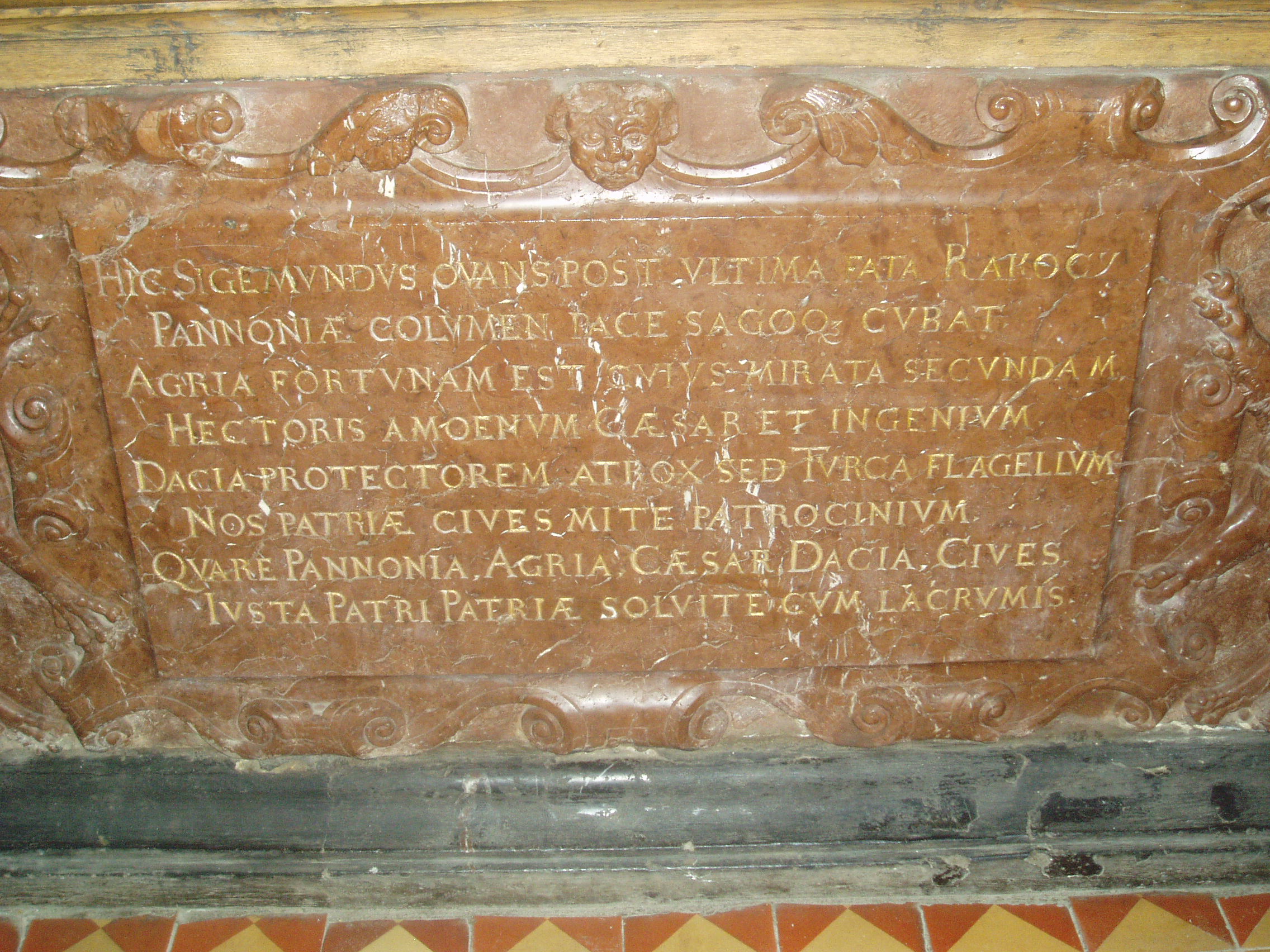 Nyilvános 1003 | 1795 | Szerencs, Kossuth tér 4. Református templom - Rákóczi Zsigmond tumbája | Szerencs legrégibb temploma a XIII. században épült eredetileg román stílusban. Az épületet 1480-ban átalakították, ekkor készült a középen álló gótikus torony. Az épületet gótikus támpillérek fogják körül. A templomot 1595-ben adományozta Rákóczi Zsigmond református hittársainak, az ő támogatásával jelentős átalakításokat is végeztek rajta. A templom nemcsak építészetileg nevezetes, hanem jelentős történelmi emlékhely is. 1605-ben az e falak között tartott országgyűlésen választották Bocskai Istvánt Magyarország fejedelmévé. A templom hajójában található Rákóczi Zsigmond (1544-1608) címerrel ékesített vörös márány szarkofágja (tumbája), amelyet 1618-ban a fejedelem három fia, György (1630-tól erdélyi fejedelem), Zsigmond és Pál készíttetett. A síremlék tetején levő latin szöveg fordítása: "Tekintetes és nagyságos felsővadászi Rákóczi Zsigmond, Borsod vármegye főispánja, a magyar király néhai lefőbb tanácsosa, először Szendrő, azután pedig Eger kapitánya és Erdély fejedelme, a magyarországi részek ura és a székelyek ispánja számára állíttatott jeles címer, akinek erénye gyakrabban híresedett el Magyarországon legnagyobb örvendezések közepette. Aki meghalt az ő kegyeletes szülőhelyén, Felsővadászon az 1608. évi december hó 5-én, midőn innen-onnan 64 évig élt. Három gyászoló fia: Rákóczi György , Zsigmond és Pál az ő legkedvesebb édesatyjuknak, aki irántuk és a haza iránt jól érdemesült." A szarkofág nyugati oldalán a következő felirat olvasható: "Tebenned reméltem Uram, hogy nem leszek porrá mindörökké! " A déli oldalon Miskolczi Csulyak István prédikátor verse őrzi Rákóczi Zsigmond emlékét (a képen ez a felirat látható): "Itt nyugszik végső lehelete után a békében és háborúban győzedelmes Rákóczi zsigmond, Magyarország oszlopa, akinek Eger csodálta szerencséjét, a császár fővezérének kies lángelméjét is, Erdély oltalmazóját, a kegyetlen török pedig ostorát, mi honfiak az ő kegyes atyai indulatát. Azért Magyarország, Eger, császár, honfiak, érdemihez illően fizessetek könnyeitekkel a haza atyjának." A síremlék alatt egy deszkaajtó felnyitása után lehet lejutni a kriptába. Ott található a fejedelem földi maradványait őrző urna, amelyet 1849-ben kapott adományul a város a X. zászlóalj tisztikarától. Bár 1644-ben, amikor Esterházy Miklós nádorispán csapatai megrohanták és kifosztották Szerencset, meggyalázták a fejedelem síremlékét is, Rákóczi Zsigmond koponyája megmaradt, s ma a kriptában egy kőurnában őrzik. Bizonyítéknak a koponyán található gyógyult fejsérüléseket tekintik, amelyeket az itt eltemetett személyek közül egyedül a fejedelem kaphatott. 1855. október 19-én járt a templomban, zempléni kirándulásuk alatt Arany János és Tompa Mihály. Arany a következőket írta levélben egy barátjának: "Szerencsen egy Rákóczi korabeli templomban láttuk Rákóczi Zsigmond fejedelem czímeres és feliratos márványravatalát.” A fénykép 2007 augusztusában készült. Felh. irod.: Tájékoztató feliratok a templomban www.szerencs.hu http://tokaj-turizmus.wplanet.hu/irodalmiut |