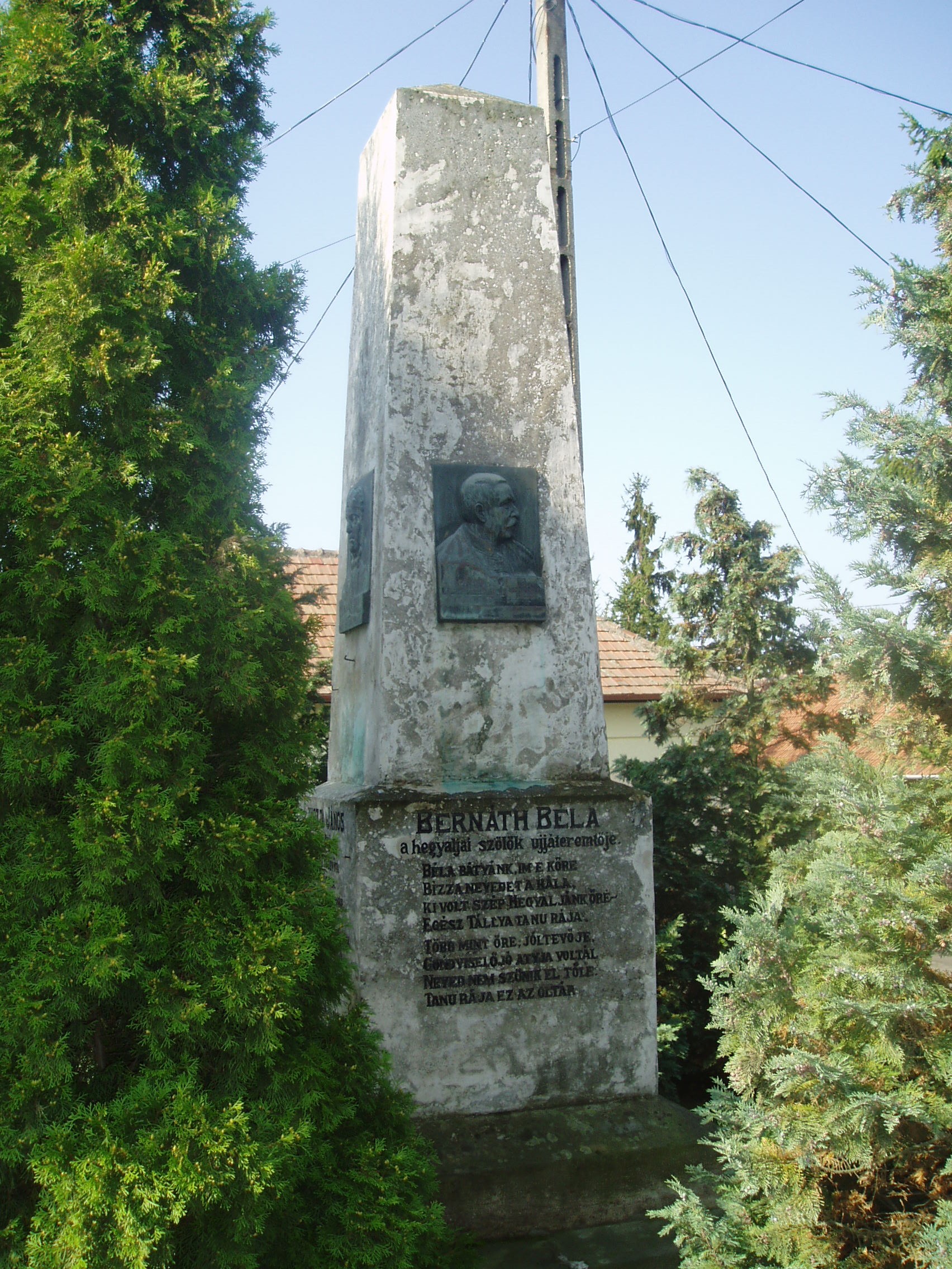 Nyilvános 1048 | 1666 | Tállya, Rákóczi utca 34. | Tállya központjában, a Polgármesteri Hivatal előtt egy 1922-ben felállított és 1994-ben felújított obeliszk látható. Három, a településsel kapcsolatba került híres személyiségnek állít emléket. Egy–egy oldalán Lavotta János, Bernáth Béla és Zempléni Árpád domborművű arcképét helyezték el, korabeli ízlésű méltató verssorokkal, a negyediken pedig a felállítás körülményeit rögzítették: Közadakozásból emelték tisztelőik és barátaik: Vikár Béla, Markó Miklós hírlapíró, Vaszari László szobrász, dr. Asztalos Kálmán, Kovács Ferenc 1922-ben. Lavotta János (1764–1820) a magyar zenetörténetben nagy szerepet játszott verbunkos triász egyik jeles tagja volt; Tállyán hunyt el (lásd: Tálly, Rákóczi u. 24.), s sírja is a helyi katolikus temetőben található (lásd: Tállya, Temető). Emlékszobája 2001. júliusában nyílt meg a Maillot–kastélyban (lásd: Tállya, Rákóczi u. 10.). Az 1878-ban született sátoraljaújhelyi főszolgabírót, Bernáth Bélát mint a hegyaljai szőlők újratelepítőjét tisztelik. A tállyai születésű Zempléni Árpád (1865–1919) — eredeti nevén Imrey Árpád — a maga korában jónevű költő volt; legnagyobb sikert aratott verseskötetének címét — Turáni dalok — is megörökítették domborművén. A fénykép 2007 augusztusában készült. Felh. irod.: Takács Péter: Tállya. Bp. Száz Magyar Falu Könyvesháza Kht., 2001. /Száz magyar falu könyvesháza/ Látnivalók Borsod-Abaúj-Zemplén megyében. Miskolc, Well-PRess, 2003 Dombóvári János: Pusztafedémestől Tállyáig. Miskolc, Szent Maximilian Kiadó, 1994 |