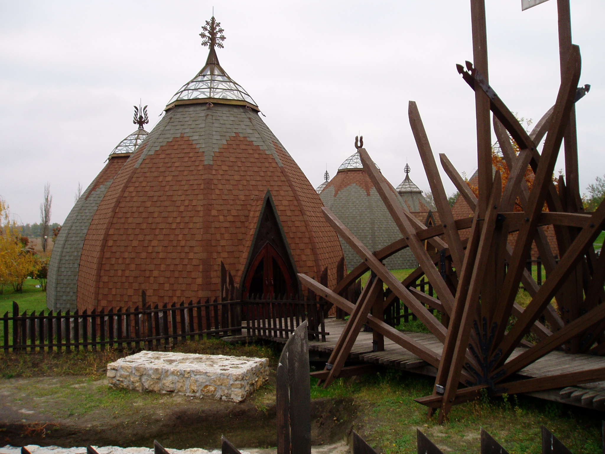 Nyilvános 1090 | 2052 | Ópusztaszer, Nemzeti Történelmi Emlékpark | Az Ópusztaszeri Nemzeti Történeti Emlékparkot az 1970-es évek legelején Erdei Ferenc szociográfus, a Magyar Tudományos Akadémia akkori főtitkára kezdeményezésére kezdték megtervezni és kialakítani. Mire 1995-re befejeződött a Feszty-körkép felújítása, Magyarország népszerű múzeumi kiállítóhelyei közül is az egyik leglátogatottabb lett. A történelmi emlékpark építészeti emlékei a honfoglaló ősök életmódját idézik. Az építészeti kialakításuk miatt is kedvelt, jurta-formájú kiállítóházakat Csete György és Dulánszky Jenő tervezte. Berendezésüket a honfoglalás kori ötvösművészetnek a motívumai ihlették. A fénykép 2004 októberében készült. Felh. irod.: www.vendegvaro.hu www.opusztaszer.hu |