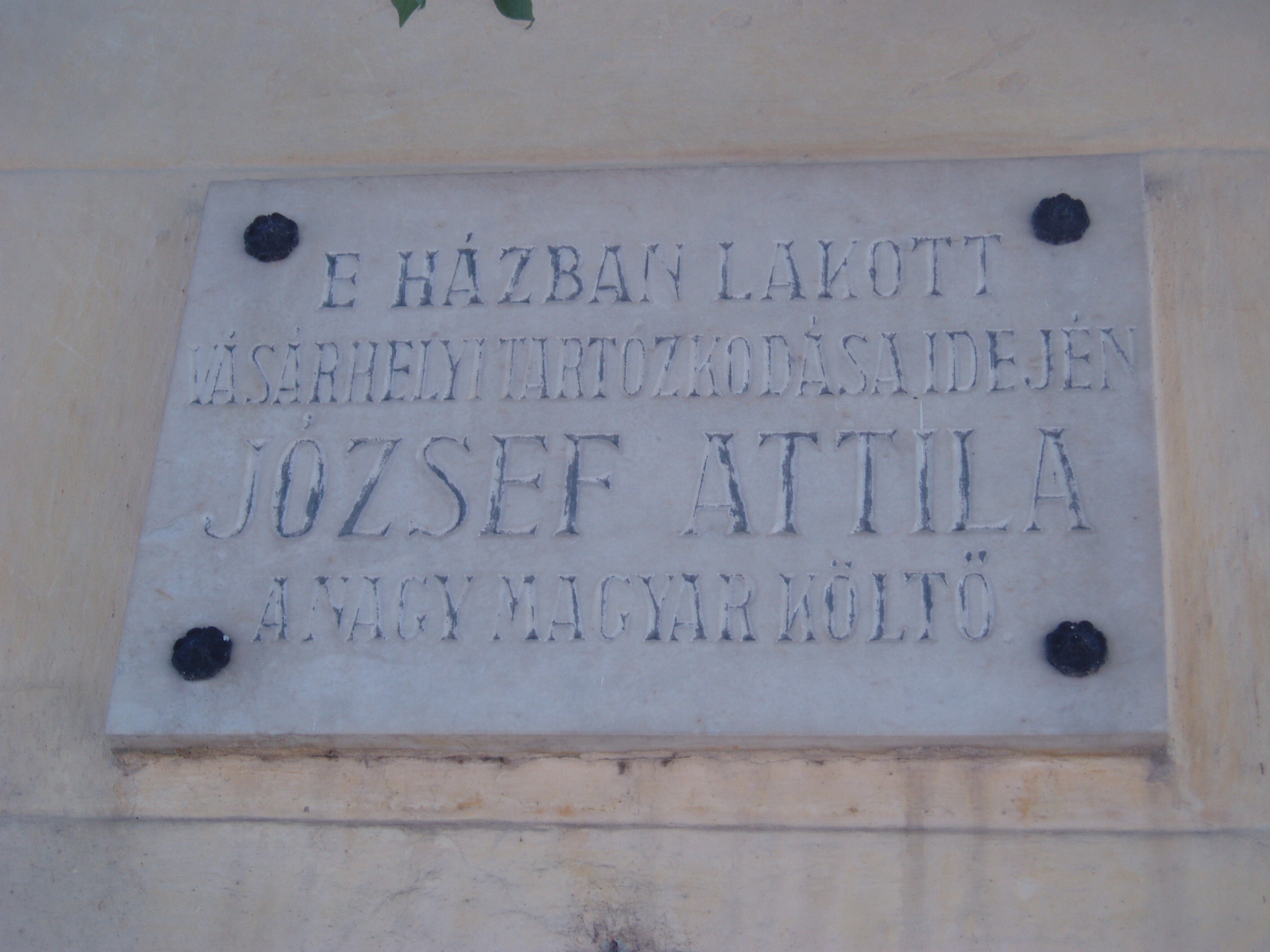 Nyilvános 1083 | 1614 | Hódmezővásárhely, Szántó Kovács János utca 28. | Ebben a házban lakott az 1930-as évek elején Makai Ödön, József Attila gyámja és sógora. Lakásukban többször megfordult a fiatal költő: 1934-ben itt dolgozott válogatott versein, amelyek Medvetánc címen jelentek meg. Makaiék később átköltöztek a város villanegyedébe (lásd: Hódmezővásárhely, Ady u. 4.). Az épületen József Attila és az egykor szintén ebben a házban élt Nagy György ügyvéd, politikus emléktáblája olvasható. A fénykép 2007 júliusában készült. Felh. irod.: Barangolások Csongrád megyében. Miskolc, Well-PRess, 1997 /Vendégváró/ |