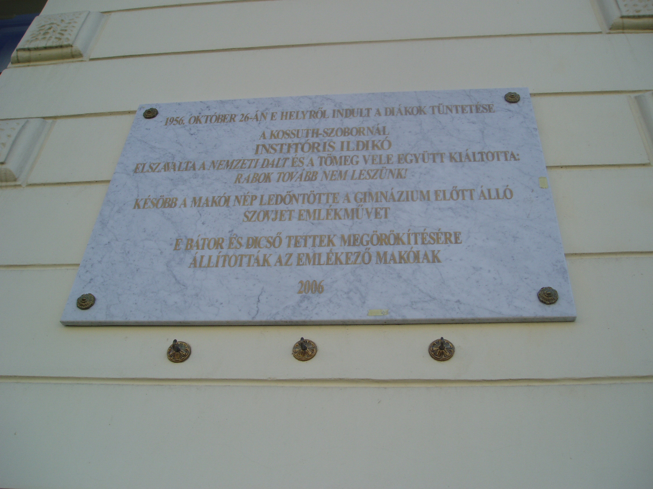Nyilvános 1039 | 1510 | Makó, Csanád vezér tér 6. József Attila Gimnázium | A város központjából északra nyílik a sugárútszerű Csanád vezér tér. Nyugati oldalán áll a József Attila Gimnázium 1895-ben, eklektikus stílusban, Gerle Lajos tervei alapján emelt épülete. Itt tanított négy évig Juhász Gyula, itt tanult József Attila, majd Erdei Ferenc. 2006-ban, az 50. évfordulón emléktáblán örökítették meg, hogy 1956. október 26-án a gimnázium elől indult a diákok felvonulása a Kossuth-szoborhoz. Később a makóiak ledöntötték az iskola előtt álló szovjet emlékművet. A fénykép 2007 júliusában készült. Felh. irod.: Barangolások Csongrád megyében. Miskolc, Well-PRess, 1997 |