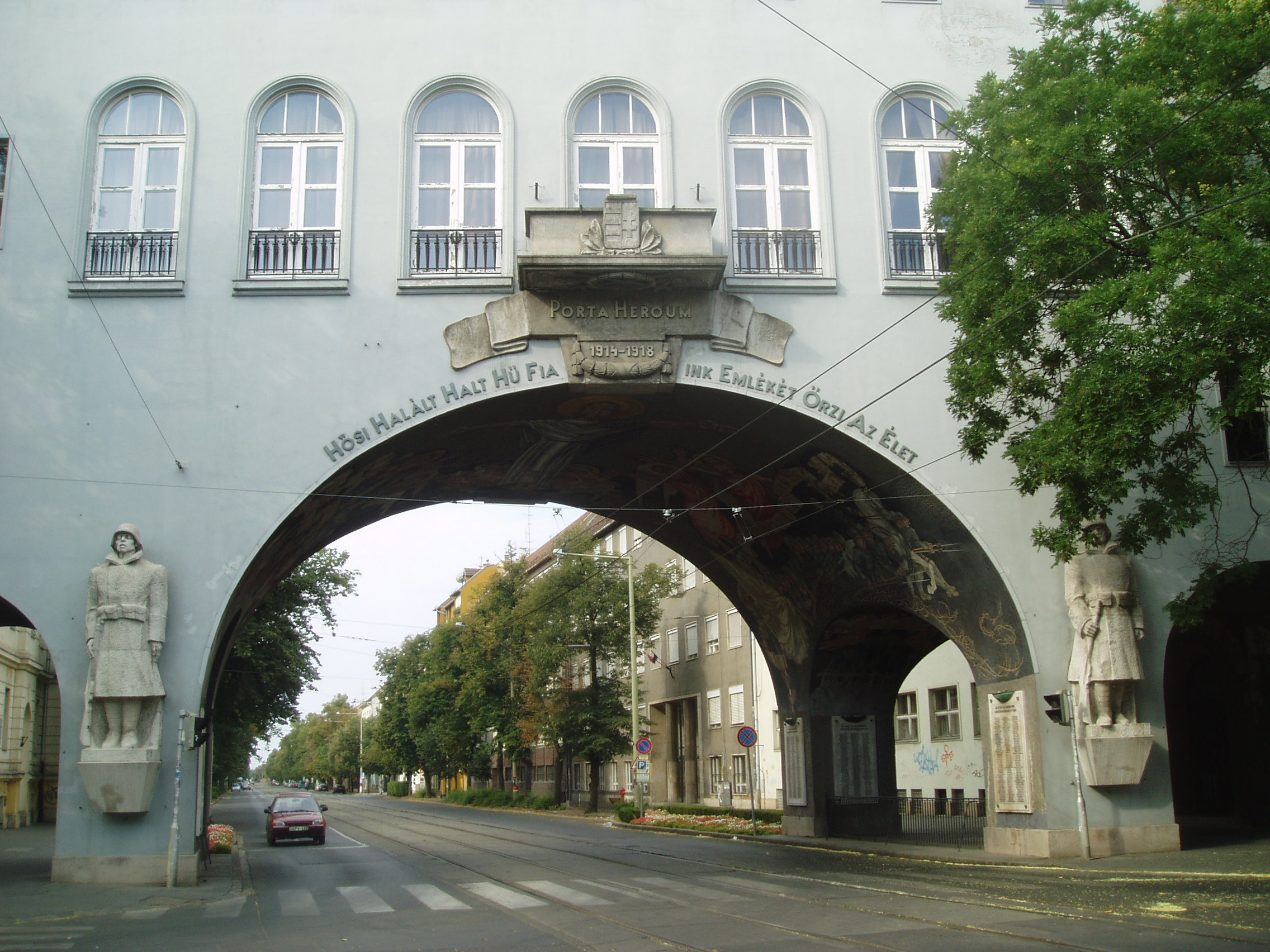 Nyilvános 1008 | 3297 | Szeged, Aradi vértanúk tere: Hősök kapuja | Az Aradi vértanúk tere déli oldalát a nagyszabású Hősök kapuja (Porta heroum) határolja. Az 1936-ban Pogány Móric tervei szerint épült kapu épült kapu honvédszobrai - az élő és a halott katona - Lőte Éva 1937-ben készült alkotásai, s az I. világháború áldozataira emlékeztetnek. A boltív freskóit Aba-Novák Vilmos készítette. A festményeket 1949-ben levakolták, csak a Millenniumra sikerült feltárni és helyreállítani őket. A művész a képsorozaton három témát jelenített meg: a háborús emlékezést, a hősi halottak dicsőítését és Horthy Miklós elindulását Szegedről. Középen, fejjel a tér felé Aba-Novák az ítélkező Krisztus mintegy 8 méteres alakját ábrázolta, lábainál a harsonás, ítélkező angyalok csoportjával. A kapu alatt kezdődik a nagyállomásra vezető Boldogasszony sugárút. A fénykép 2007 júliusában készült. Felh. irod.: www.vendegvaro.hu |