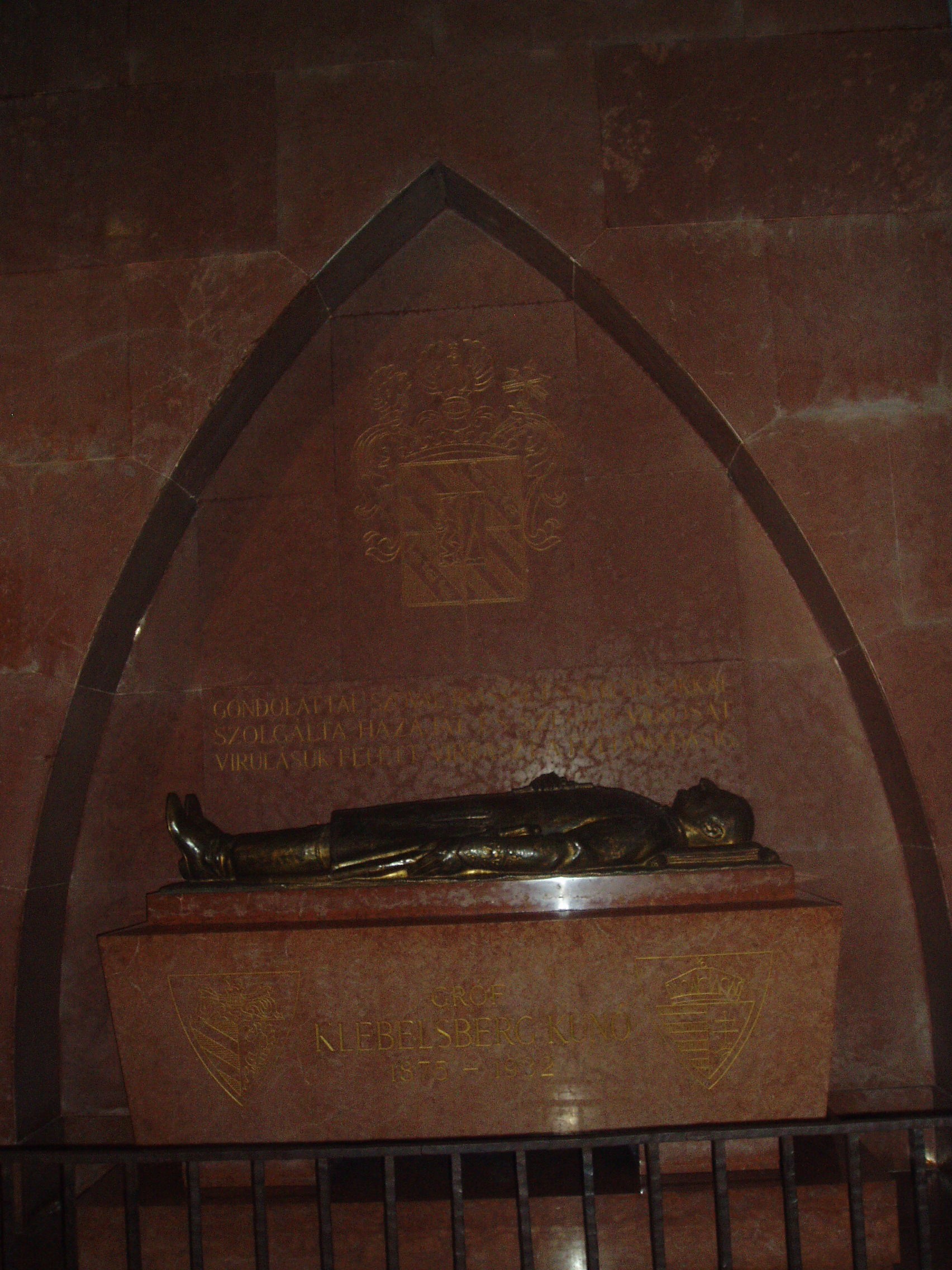 Nyilvános 961 | 1680 | Szeged, Dóm tér: Fogadalmi templom: Klebelsberg Kunó sírja | A neves jogász, országgyülési képviselő, művelődéspolitikus, kiemelkedő jelentőségű vallás- és közoktatásügyi miniszter szorosan kötődött Szegedhez, amelynek 1927-től haláláig országgyűlési képviselője is volt. Szellemi nagyságát, hihetetlen munkabírását és államférfiúi erényeit kortársainak legjobbjai és politikai ellenfelei egyaránt mind tisztelték. 56 éves korában, 1932. október 12-én hirtelen bekövetkezett halála mélyen megérintette a vezető politikai elitet. A temetése körüli megmozdulás hasonlatos volt Kossuth Lajos temetéséhez. A Nemzeti Múzeumban ravatalozták fel, majd koporsóját Szegedre kísérték, abba a városba, ahol - saját szavai szerint „népével lelki és politikai közösségre” talált. Végakaratának értelmében a Fogadalmi templomban helyezték örök nyugalomra. 2000-ben a Széchenyi téren állították fel Melocco Miklós által készített emlékművét. (A felvétel sajnos sötétre sikerült, de feltettem, mert az interneten egyáltalán nem találtam képet a síremlékről. K. K.) A fénykép 2007 júliusában készült. Felh. irod.: www.bibl.u-szeged.hu/ha/bio/klebi/klebi.html www.wikipedia.org |