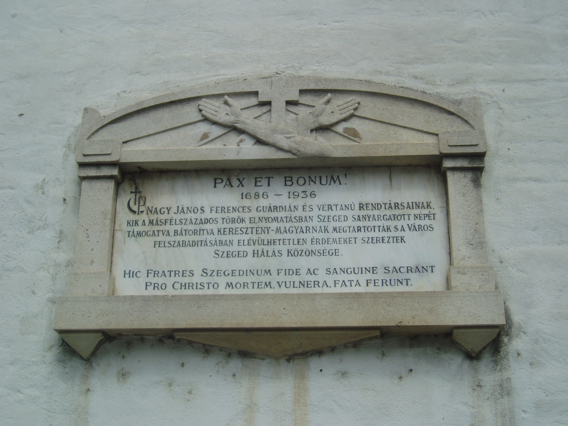 Nyilvános 1022 | 1422 | Szeged, Mátyás tér: Alsóvárosi templom | A templom és szerzetesei a török hódoltság idején nagy nemzeti, anyanyelvi hivatást teljesítettek mint a Délvidék magyar népének egyedüli lelkipásztorai. Ennek az időszaknak és név szerint Nagy János rendfőnöknek állítottak emléket a templom külső homlokzatán 1936-ban elhelyezett táblával. A fénykép 2007 júliusában készült. Felh. irod.: Bálint Sándor: A Szeged-alsóvárosi templom. Bp. Pannonia, 1966 |