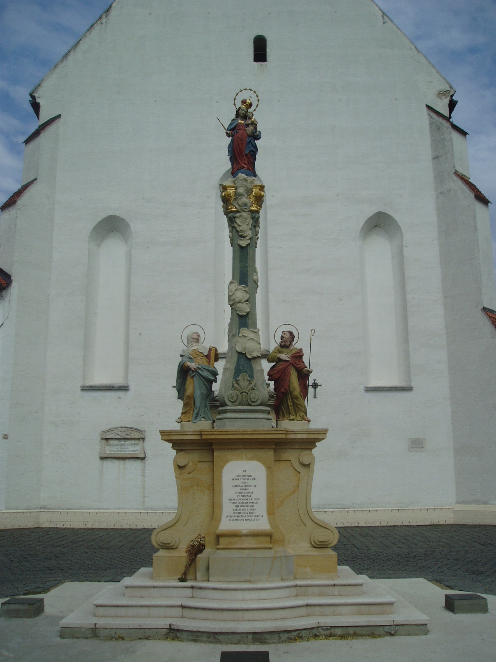 Nyilvános 1016 | 1476 | Szeged, Mátyás tér: Alsóvárosi templom | A gótikus Havi Boldogasszony-templom az Alföld egyik legnagyszerűbb középkori műemléke. A mellé épült kolostorral együtt 1444-től évszázadokon keresztül a ferencrendi barátok tulajdona volt. A templom a magyar késő gótikus templomépítészet egyik legérettebb alkotása. Főbejárata elé a közelmúltban került vissza a tönkrement, és darabjaiból restaurált Szeplőtelen Fogantatás-szobor (Mária-oszlop). Az ismeretlen mester által budai mészkőből faragott Mária-oszlopot eredetileg 1752-ben állították fel, Tóth József akkori szenátor jóvoltából. A legenda szerint egyszer egy idegen katona „Lássuk, a katolikusok istenasszonya képes-e magát megvédeni!“ – felkiáltással rálőtt a szoborra. El is találta Szűz Mária alakját, amelynek jobb karja letört – ezért nevezték akkoriban Csonka Szűznek –, de a golyó visszapattant, és halálra sebezte a férfit. 1948-ban, az akkor már igen rossz állapotban lévő, jégverés által is megrongált szobrokat lebontották, majd 1950-ben a ferences szerzetesek – attól tartva, hogy a kommunista hatóságok megsemmisítik a vallásos témájú kincseket – elásták a rendház istállójában. A kolostor felújításakor 1991-ben kerültek elő az elveszettnek hitt műkincsek. Rákos Péter restaurátorművész vezetésével újjávarázsolták a szoborcsoportot és 2006-ban felállították régi helyén. A fénykép 2007 júliusában készült. Felh. irod.: Péter László: Szeged. Bp. Panoráma, 1981 Bálint Sándor: A Szeged-alsóvárosi templom. Bp. Pannónia, 1966 Mezei András: Mária és társai újra a Mátyás térre kerülnek. = A Szeged-Alsóvárosi Ferences Plébánia Hírlevele 2006. 2. |