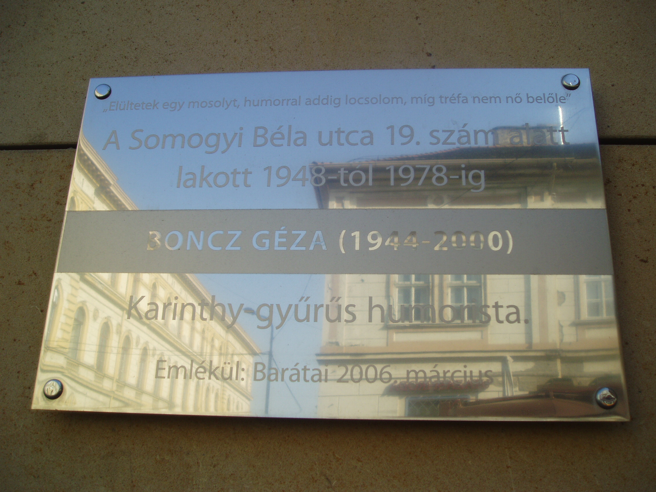 Nyilvános 1012 | 1391 | Szeged, Somogyi utca 19. | Ebben a házban lakott gyermek- és ifjúkorában Boncz Géza (1944-2000) Karinthy-gyűrűvel kitüntetett humorista. Emléktábláját barátai állították 2006-ban. A Boncz családot 1945-ben Nagybányáról telepítették át Szegedre. Boncz Géza eredetileg műszaki és villamossági eladói képesítést szerzett, majd a szegedi Kristály zenekar tagja lett. 1970-ben gimnáziumi érettségi vizsgát tett, ugyanettől az évtől az orvostudományi egyetem klubját vezette. 1974-ben 3. helyezést ért el a Magyar Rádió I. Humorfesztiválján. Ettől kezdve a Rádiókabaré rendszeres szereplője lett, s 1975-ben a fővárosba költözött. A fénykép 2007 júliusában készült. Felh. irod.: www.szineszkonyvtar.hu |