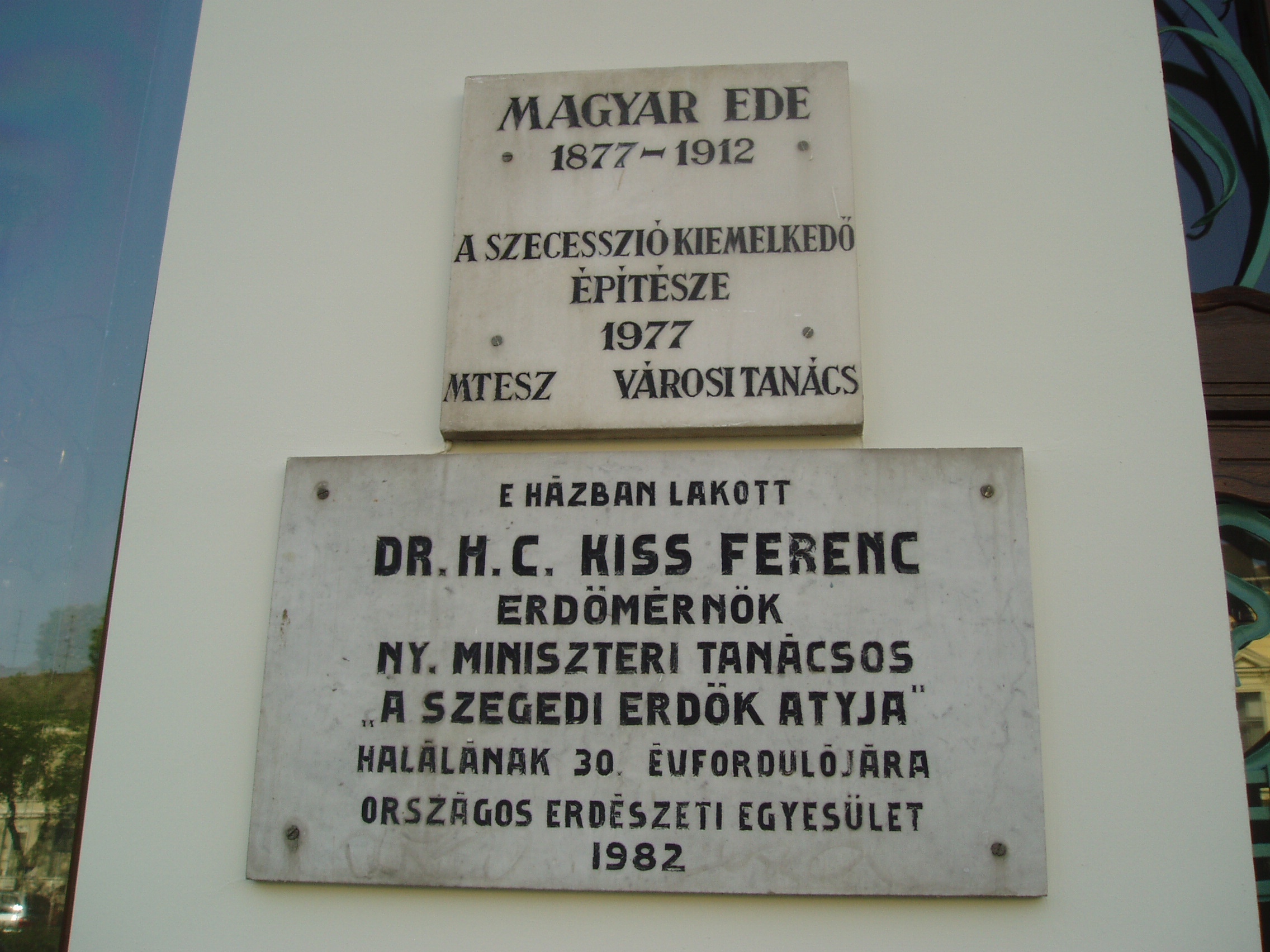 Nyilvános 1085 | 1456 | Szeged, Tisza Lajos körút 56. Reök-palota | A Reök-palota 1907-ben épült szecessziós stílusban Magyar Ede (1878-1912) tervei szerint. Az annakidején lakóházként funkcionáló épület lakója volt Kiss Ferenc főerdőtanácsos. 1860-ban született a Sopron megyei Szilsárkányban, egyszerű parasztszülők nyolcadik gyermekeként. A selmecbányai Erdészeti Akadémián szerzett erdőmérnöki oklevelet, majd 1885-ben erdőtisztként Szegedre került, hogy felügyelje a város körüli, állami kezelésbe adott erdőket. Szívügye volt az Alföld homokterületeinek betelepítése, nem véletlenül nevezték "a szegedi erdők atyjának". A palotán Magyar Ede építész emléktábláját is elhelyezték. A fénykép 2007 júliusában készült. Felh. irod.: Péter László: Szeged. Bp. Panoráma, 1981 www.puszta.com/hun/programs/cikk/reok_palota_ujjaszuletese |