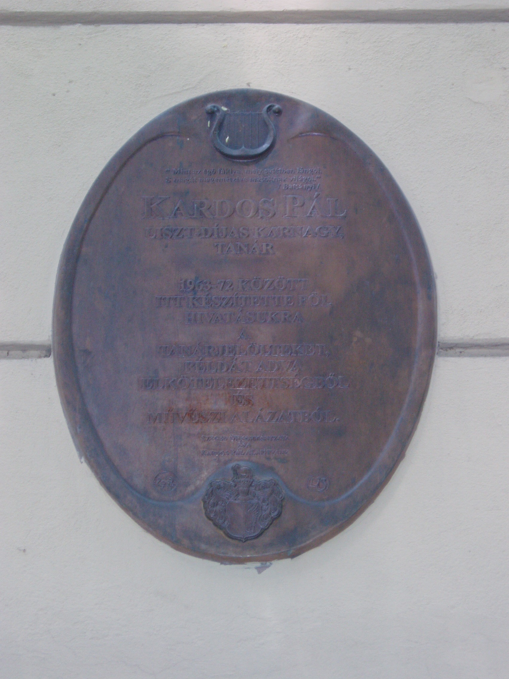 Nyilvános 1080 | 1705 | Szeged, Szentháromság utca 70-76. | Az egyházi Karolina Iskola épületében az elmúlt rendszer idején a Juhász Gyula Tanárképző Főiskola Ének–zene Tanszéke működött. Itt tanított Kardos Pál Liszt–díjas karnagy, aki 1961–1972 között a főiskola leánykarát is vezette. Kardos Pál tanári személyisége, művészi igényessége meghatározóvá vált növendékei és kollégái körében. Emléktábláját 2002. március 22-én avatták fel az épület falán. Az épületen portrédomborműves emléktábla idézi Bálint Sándor néprajztudós (1904–1980), „a legszögedibb szögedi” alakját, aki 1937 és 1941 között az itt működő Iskolanővérek tanítóképzőjének tanára volt. A fénykép 2007 júliusában készült. Felh. irod.: Tizenkét év kőben és ércben. Szeged, Önkormányzat, 2002 |