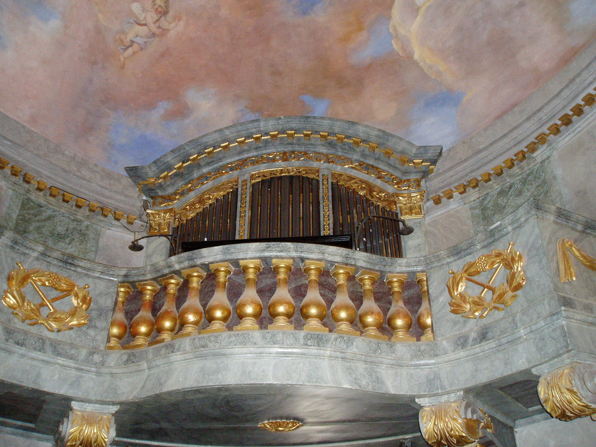 Nyilvános 1151 | 3006 | Nagycenk, Mauzóleum: orgonakarzat | A Széchényi család nyughelyét a temető létesítésével egyidőben Széchényi Ferenc építtette 1778-ban. A barokk stílusú sírkápolnát 1806-10 között klasszicista előtérrel bővítették. A téglalap alakú előcsarnok kazettás mennyezetét ion oszlopok tartják. Az ovális alaprajzú kápolnát kupola fedi, több kutató véleménye szerint Dorffmeister István freskóival. Innen jutunk a kriptába, a család számos jeles tagjának végső nyughelyére. A fénykép 2005 júliusában készült. Felh. irod.: Látnivalók Győr-Moson-Sopron megyében. Miskolc, Well-PRess, 2000 |