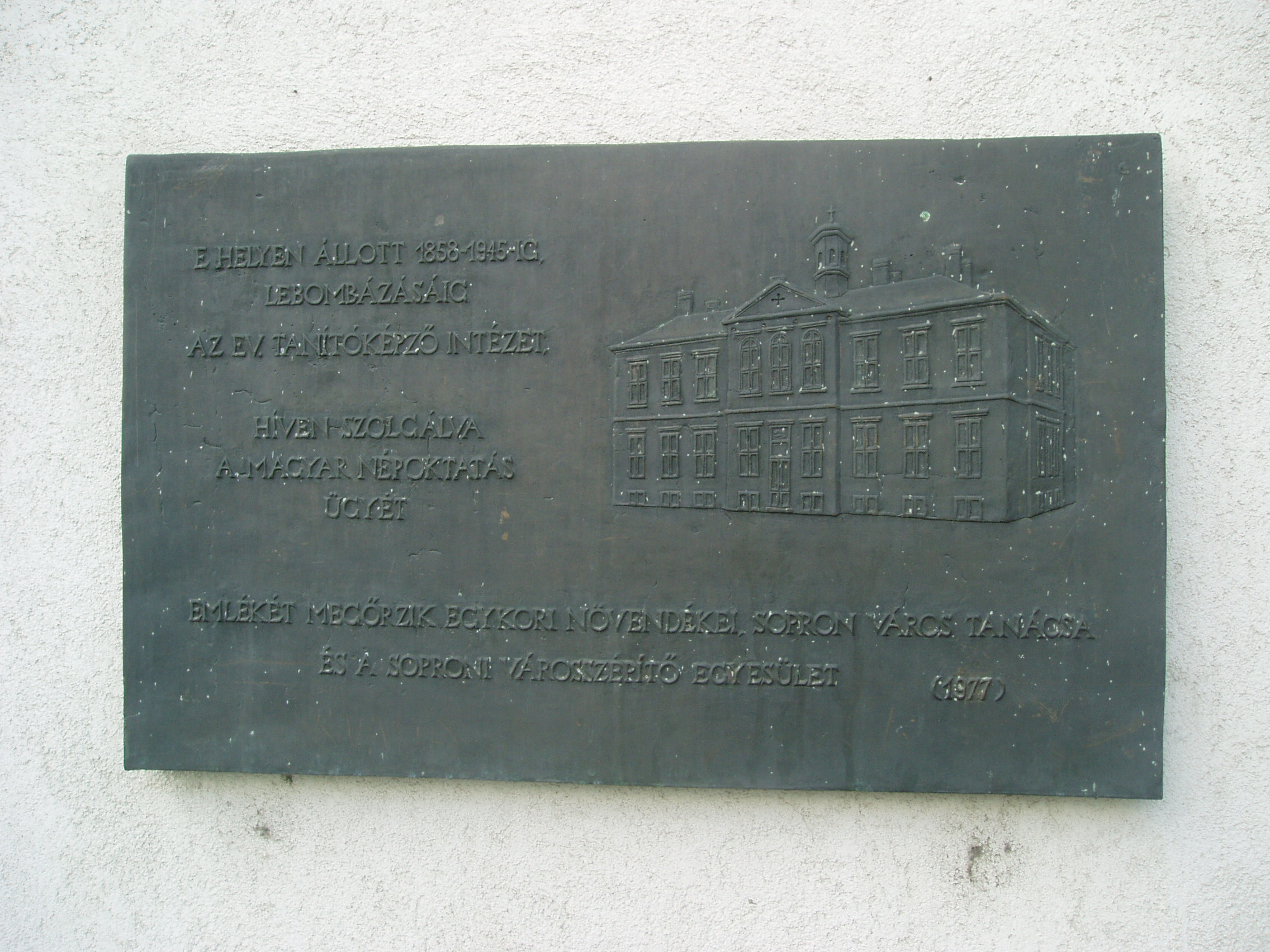 Nyilvános 1054 | 1330 | Sopron, Frankenburg utca 24. | A Frankenburg utca és a Deák tér sarkán állt egykor soproni evangélikus tanítóképző intézet. A modern utódépületen elhelyezett emléktáblán az 1945-ben lebombázott iskolaépület ábrázolása látható. A fénykép 2008 júniusában készült. |