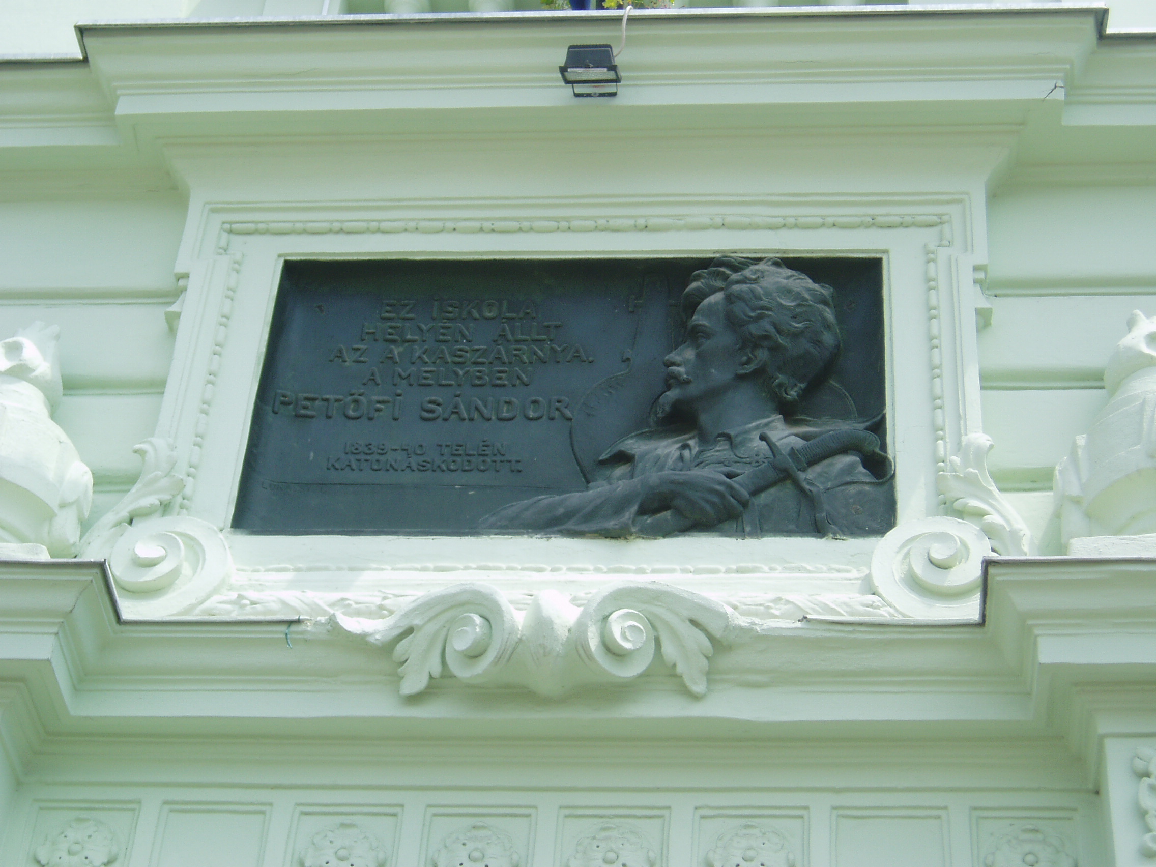 Nyilvános 1015 | 1482 | Sopron, Halász utca 25. | A Petőfi Sándor Általános Iskola falán emléktábla hirdeti, hogy valaha helyén az a kaszárnya állt, amelyben 1839/40 telén katonáskodott Petőfi Sándor. A fénykép 2008 júniusában készült. |