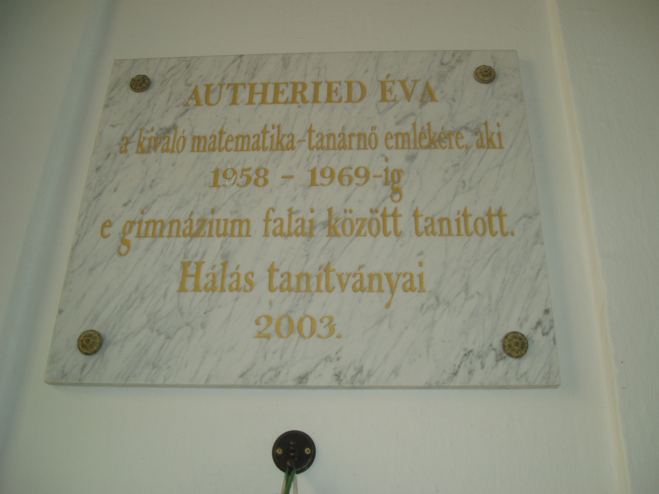 Nyilvános 1035 | 1789 | Sopron, Liszt Ferenc utca 1. | A Széchenyi István Gimnázium eredetileg reáliskola volt, amelyet 1850-ben alapítottak (lásd: Liszt Ferenc utca 2.). A Liszt Ferenc utca sarkán álló épületrészét, amelynek ezen a képen az udvari része látható, 1872-ben építették. Az épületen több tanár emlékét is feliratos tábla hirdeti. A képen láthatót Autheried Éva matematika szakos tanár eemlékére állították, aki 1958-1969 között volt a gimnázium tanára. A fénykép 2008 júniusában készült. Felh. irod.: http://szig.sopron.hu/ |