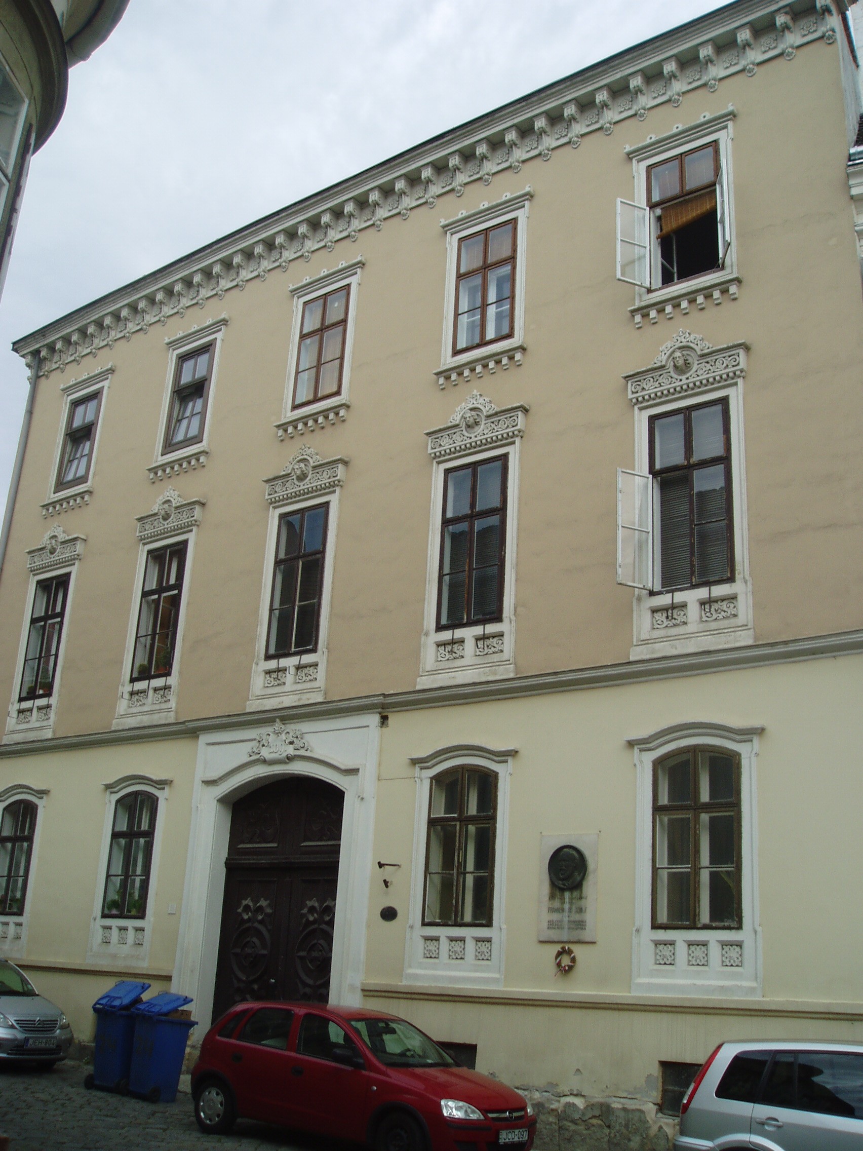 Nyilvános 1016 | 1438 | Sopron, Szent György utca 24. | Az 1860 körül emelt romantikus stílusú épületben lakott Frankenburg Adolf író, szerkesztő és Carina Anna operaénekesnő. Miután belső munkatársa volt Kossuth Pesti Hírlapjának, Frankenburg indította útjára a magyar irodalomtörténetben jelentős szerepet játszó Életképek című folyóiratot. Működése nem volt ínyére a kormányzatnak, ezért 1847-ben kancelláriai titkárnak Bécsbe helyezték. Mintegy két évtizedig élt ott. Sok zaklatásnak volt kitéve, ugyanis gyanúba fogták, hogy szerepet játszott a bécsi felkelés kirobbantásában. 1866-ban nyugdíjazását kérte s hazatért Magyarországra. Második felesége volt Carina Anna, aki 1863 és 1867 között állandó tagja volt a Nemzeti Színház operatársulatának. Ezután Bécsbe szerződött, s a pár a közeli Sopronban telepedett le. Csak hosszú együttélés után, 1881-ben tudtak házasságot kötni, amely rövid életű lett: Frankenburg 1884-ben, Carina Anna 1885-ben elhunyt. Sopronban Frankenburg megalapította az Irodalmi és Művészeti Kört, mely később felvette nevét. Az épületen csak Frankenburg nevét örökíti meg emléktábla, Neszthy Egonné Haich Erzsébet munkája (1934), s évszáma is hiányos. A kép 2008 júniusában készült. Felh. irod.: Berecz Dezső: Frankenburg Adolf harmadik felesége. = Soproni Szemle 1941 Berecz Dezső: Megemlékezés Frankenburg Adolf halálának századik évfordulóján. = Soproni Szemle 1984. 3. |