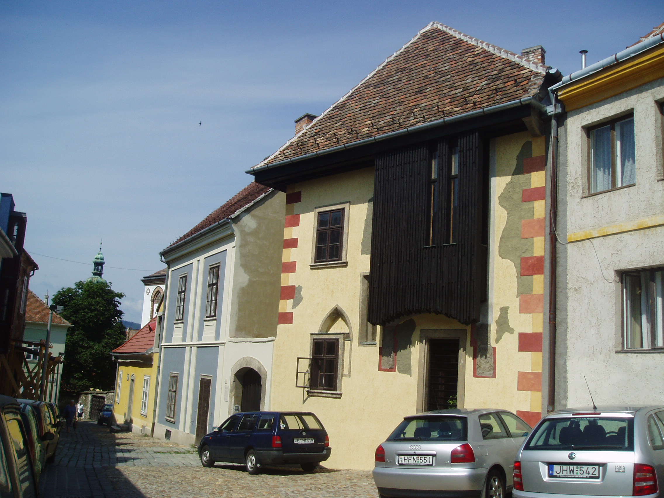 Nyilvános 982 | 1455 | Sopron, Szent Mihály utca 3. | Az egyemeletes épület voltaképpen két lakóház, amelyeket kapuval áttört kerítésfal tart össze. Az északi ház, amelynek sarkain színes kváderezés látható, a XIV. század közepén épülhetett, utcai homlokzatán felismerhetők a gótika jellemzői. A bal oldali épületrész homlokata XIX. századi jellemzőket mutat, udvari része azonban középkori elemeket is őriz. Ennek utcára néző földszinti szobájában maradt meg Magyarország legkorábbi, 1460-ban készült fafödéme. A kép 2008 júniusában készült. Felh. irod.: Czellár Katalin: Sopron. 3. jav. kiad. Bp. Panoráma, 2000 |