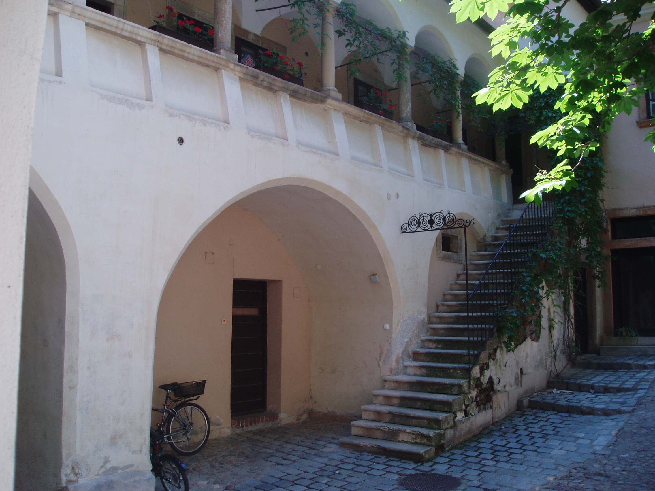 Nyilvános 1008 | 1593 | Sopron, Templom utca 12. | Az eredetileg egyemeletes középkori lakóházra a XVII. századi késő reneszánsz, kora barokk átépítése során került a bejárati kapu felett félkörívesen kidomborodó zárt erkély, és ebből az időből kelteződik az udvari front kialakítása is. 1770 körül építették rá a második emeletet, amikor a Lassberg grófi család birtokába került. Az első emeleti nagyteremben ekkor városszerte híres bálokat rendeztek. 1866-ban vette meg az evangélikus konvent az épületet paplak céljaira, és azóta is az evangélikus egyház tulajdona. Dongaboltozatos, hosszú kapubejárójában a két oldalt kőráccsal díszített gótikus ülőfülkesor 1400 körül készült. A középkori eredetű épület 1866-ban került az evangélikus egyház tulajdonába, előbb paplakként hasznosították, majd ez lett Evangélikus Országos Múzeum soproni kiállítóhelye. A kép 2008 júniusában készült. Felh. irod.: Czellár Katalin: Sopron. 3. jav. kiad. Bp. Panoráma, 2000 |