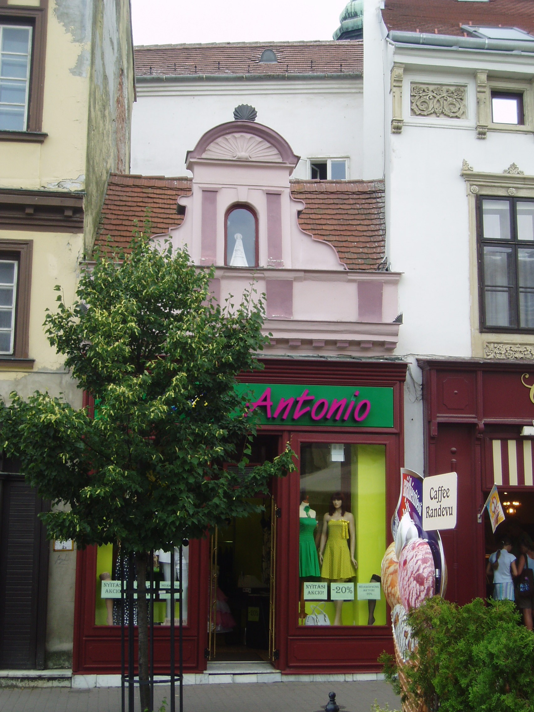 Nyilvános 943 | 1479 | Sopron, Várkerület 42. | Sopron - és talán az egész ország - legkisebb üzletháza: alapterülete mindössze 1 négyszögöl. A kép 2008 júniusában készült. Felh. irod.: Czellár Katalin: Sopron. 3. jav. kiad. Bp. Panoráma, 2000 |