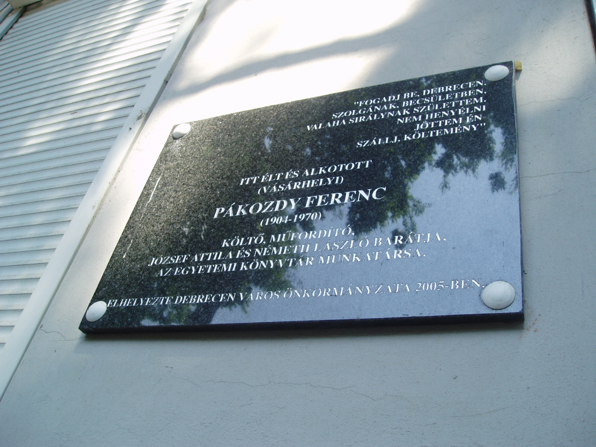 Nyilvános 1088 | 1670 | Debrecen, Darabos utca 61. | Mint az épületen elhelyezett fekete márványtáblán olvasható, ebben a házban élt és alkotott Pákozdy Ferenc (1904-1970) költő, műfordító, az Egyetemi Könyvtár munkatársa. Orvosnak készült, majd jogot hallgatott, jog- és államtudományi doktorátust szerzett. 1928–1944 között újságíró volt különböző lapoknál. 1945 után szülővárosában, Hódmezővásárhelyen dolgozott. 1952-től élt Debrecenben. A harmincas években József Attila pártfogója és értő kritikusa volt, költészete mellett a Külvárosi éj című verséről írott recenziójában állt ki (megjelent a hódmezővásárhelyi Hétfői Újságban 1933. jan. 2.án). A fénykép 2006 júniusában készült. Felh. irod.: Magyar életrajzi lexikon |