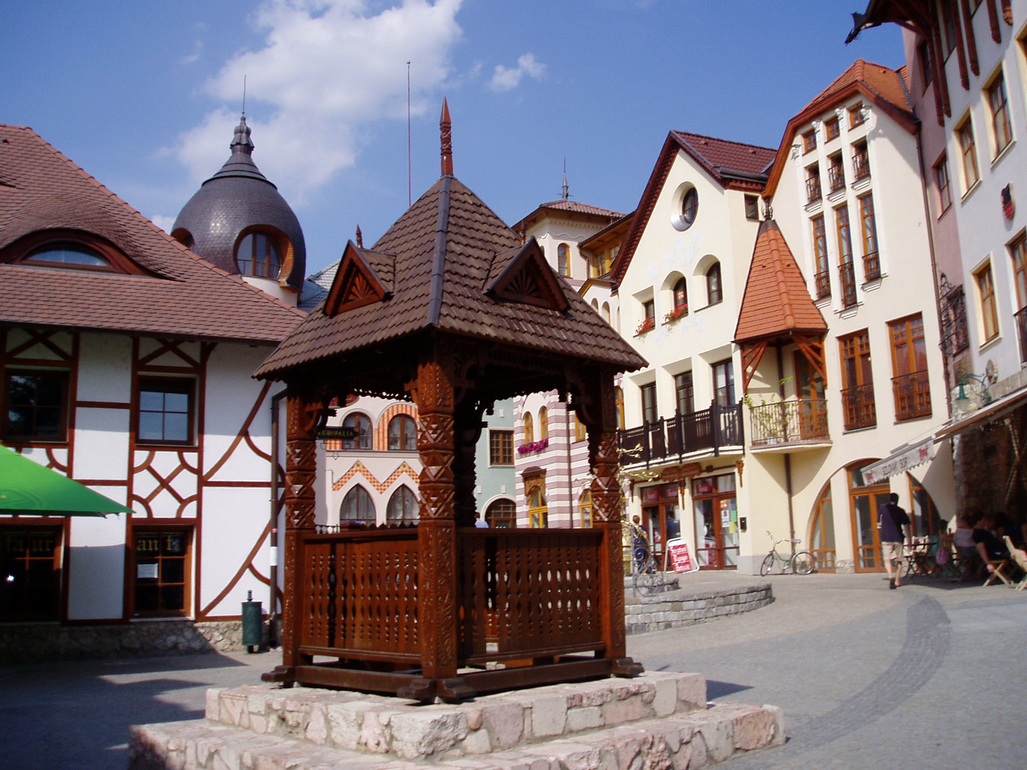 Nyilvános 1787 | 6488 | Rövid leírás | Teljes leírás (649 B) | Komárom (Komárno), Európa udvar A közelmúltban a Zichy–palota (lásd: Klapka tér 9.) udvarán építették ki az ún. Európa udvart. A helyi viszonylatban gigantikus méretű vállalkozás célja, hogy élőben mutassa be harmincöt európai ország építészetét. A városrész egyben Komárom új szolgáltató központja is, üzletekkel, éttermekkel, kávézókkal, valamint egy föld alatti bevásárlóközponttal. A fénykép 2005. júliusában készült. Felh.irod.: www.komarno.sk Mácza Mihály: Komárom nevezetességei. Pozsony, Madách-Posonium, 2002 |