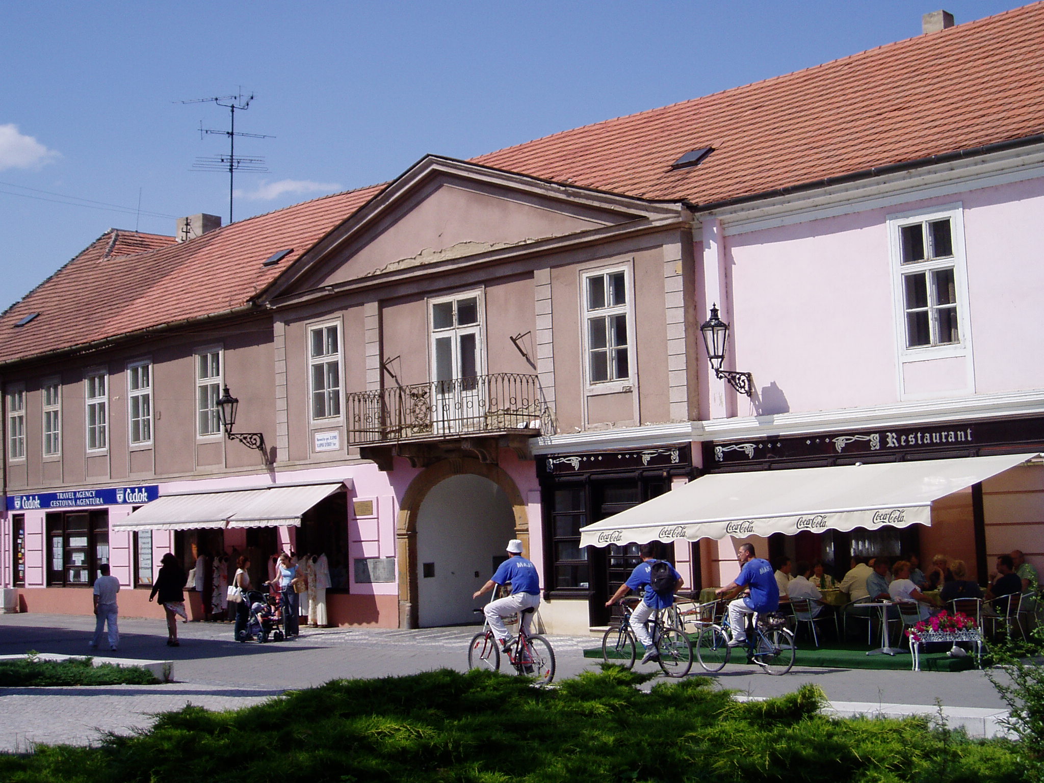 Nyilvános 1078 | 2172 | Komárom (Komárno). Klapka tér 9. Zichy-palota | A Klapka tér legnagyobb épülete a volt Zichy–palota. Zichy Miklós gróf, szabolcsi főispán építtette a XVII. század második felében. Eredetileg barokk stílusú volt, de miután a 1763-as nagy komáromi földrengés romba döntötte, klasszicista stílusban épült újjá, két épületszárnnyal bővülve. Udvarának végén az 1800-as évek elejétől 1827-ig emeletes épület állt, ennek emeleti részén tartották a táncmulatságokat és a színházi előadásokat. Az első hivatásos magyar színtársulat Komáromban Benke József és Kemény János vezetésével lépett fel 1811 májusában (ők a második pesti színtársulatból váltak ki). A társulatban ott volt Balogh István, Déry István, Láng Ádám, Murányi Zsigmond, Murányiné Lefèvre Teréz és a pályája legelején levő, tizennyolc éves Scheckenbach (Schenbach) Róza, aki később Déryné Széppataki Róza néven vált a magyar játékszín történetének állócsillagává. Legközelebb Balogh István székesfehérvári társulata jutott el Komáromba, valamikor 1813 és 1815 között. Szinnyei József szerint ennek a társulatnak Katona József is tagja volt, s Idegen művésznéven fellépett itt a Hamlet címszerepében és saját, Luca széke című darabjában. 1819 októberében Kilényi Dávid kecskeméti társulata érkezett a városba. Előadásaikról Ásvay Jókay József, Jókai Mór édesapja tudósított a helyi sajtóban. A közelmúltban a Zichy–palota udvarán építették ki az ún. Európa udvart. A helyi viszonylatban gigantikus méretű vállalkozás célja, hogy élőben mutassa be harmincöt európai ország építészetét. A városrész egyben Komárom új szolgáltató központja is, üzletekkel, éttermekkel, kávézókkal, valamint egy föld alatti bevásárlóközponttal. A palota első emeletén (bejárat a képen látható kapun a Szentháromság-szobor mellett) a város két híres szülötte, Jókai Mór és Lehár Ferenc emlékkiállítása látható. Különösen a Jókai-kiállítás gazdag eredeti relikviákban. A fénykép 2005. júliusában készült. Felh.irod.: www.komarno.sk Mácza Mihály: Komárom nevezetességei. Pozsony, Madách-Posonium, 2002 Szénássy Zoltán: Rév–Komárom. KT Kiadó, 1998 Tóth László: "...miként hajdan az apostolok" : a komáromi magyar színjátszás története. Dunaszerdahely, Lilium Aurum, 1997 |
