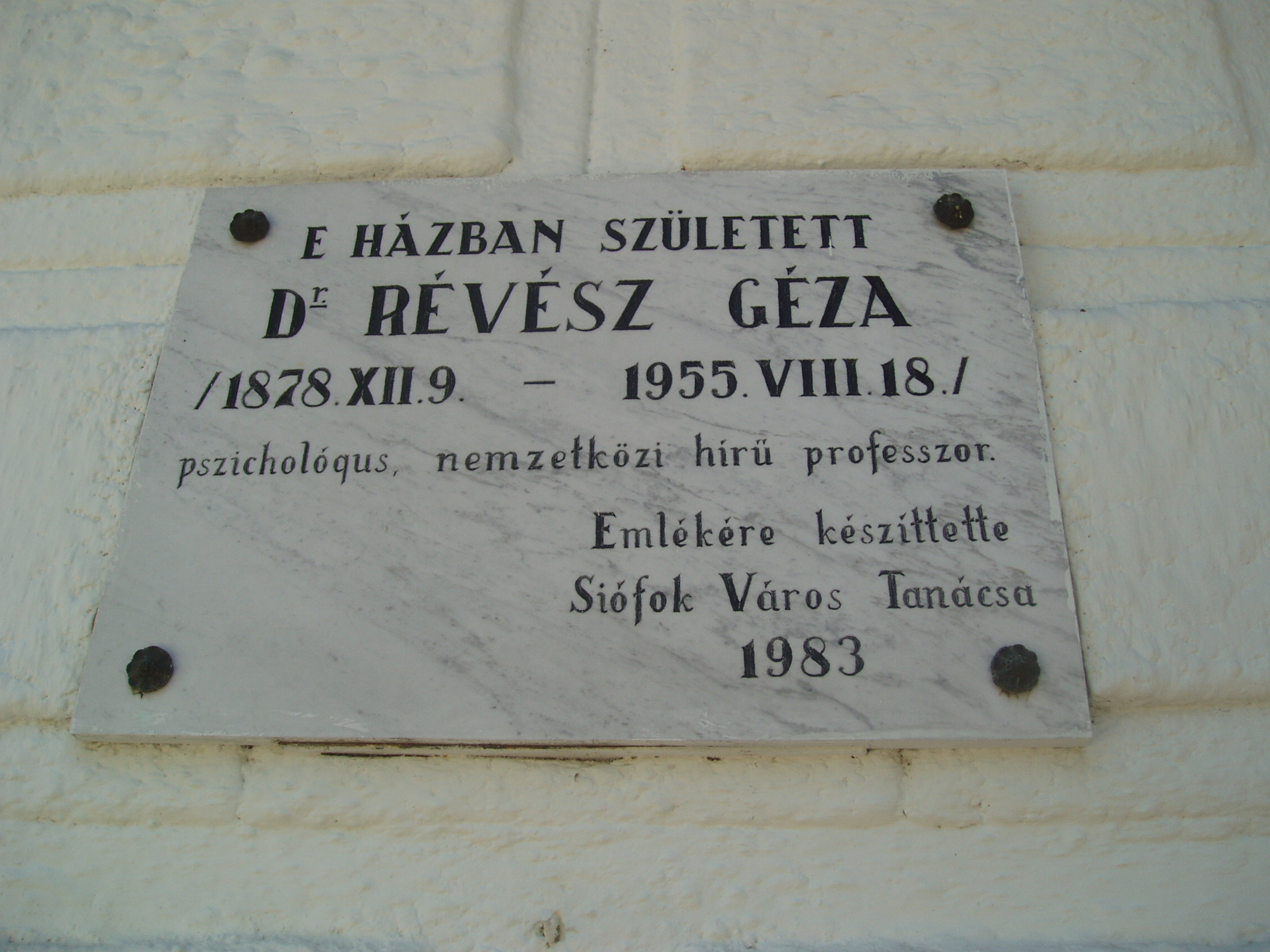 Nyilvános 1049 | 1915 | Siófok, Bajcsy-Zsilinszky utca 48. | 1878. december 9-én ebben a házban született Révész Géza pszichológus, nemzetközi hírű professzor. Elsősorban zenepszichológiával és hangfiziológiával foglalkozott. 1919-ben emigrált. 1921-től Amszterdamban működött, mint az ottani kísérleti lélektani intézet igazgatója. 1932-1950 között az amszterdami egyetemen a lélektan tanára volt. 1949-től a bajor tudományos akadémia tagja. A würzburgi egyetem díszdoktorává avatta. Amszterdamban hunyt el 1955. augusztus 18-án. A fénykép 2006 júliusában készült. Felh. irod.: Magyar életrajzi lexikon |