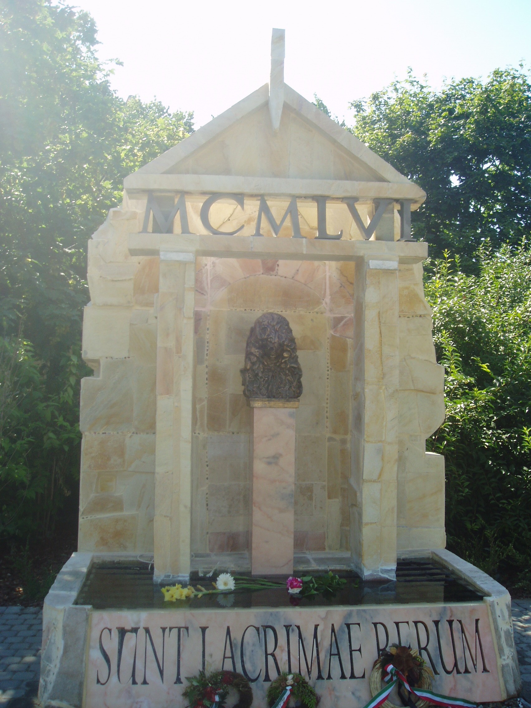 Nyilvános 1092 | 2101 | Siófok, Millennium park: 1956-os emlékmű | Az 1920-ban épült, hajdani pompájában felújított állomásépület előtt 1994-ben készült el a 16 ezer négyzetméteres Millennium park. Gyönyörű pázsit, különleges cserjék, virágok, szobrok, tavacska, este díszkivilágítás ékesíti a területet. Itt állították fel 1956 ötvenedik évfordulóján a város 56-os emlékművét, Varga Tamás: Könnyek kútja című alkotását. Varga Tamás szobrászművész Siófokon született, ahol már több szobra is áll. A Könnyek kútja című műalkotás középpontjában egy könnyező női arcot formázott, emlékeztetve arra, hogy 1956 után tilos volt az erkölcsi megemlékezés, sőt még sírni sem volt szabad. A felirat - "Sunt lacrymae rerum" - Vergilius: Aeneis című eposzából származik. Magyar fordítása: Van a tárgyaknak könnye. A fénykép 2006 júliusában készült. Felh. irod.: http://www.siofok.hu/szobor_konnyek_kutja.php |