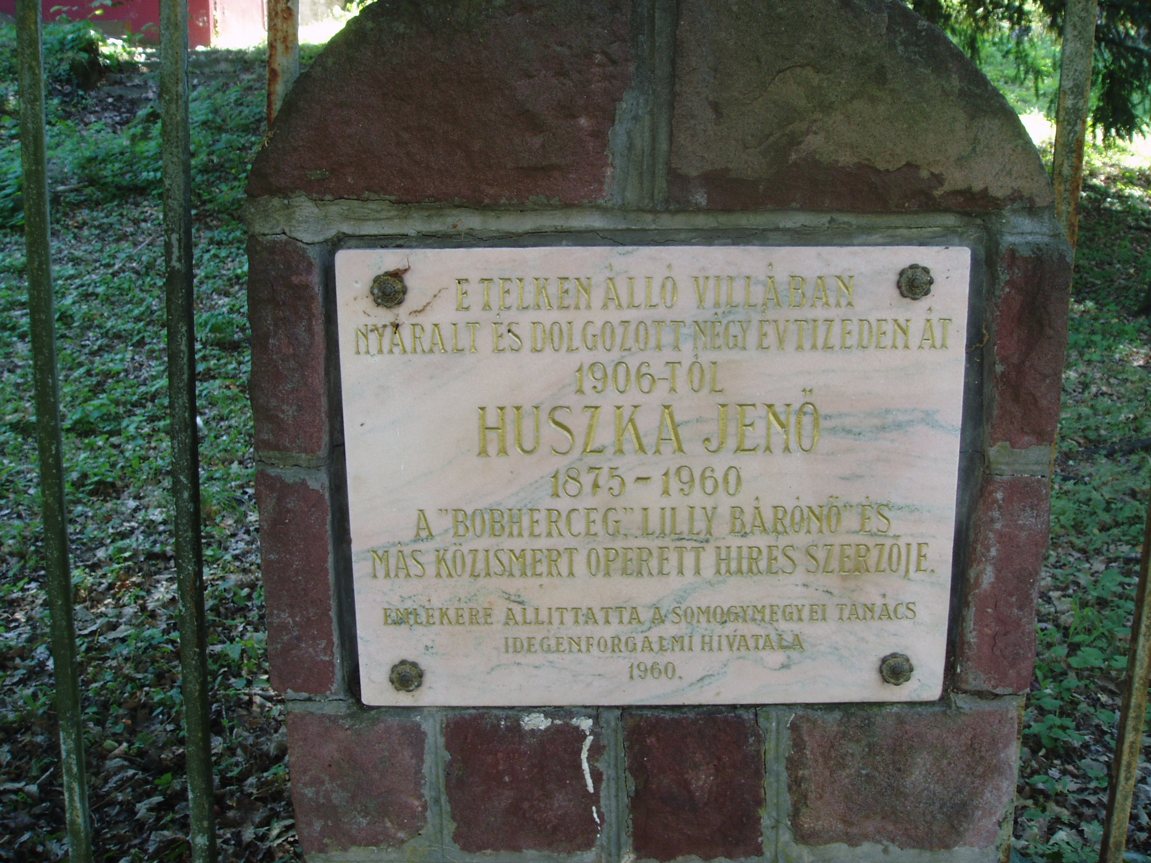 Nyilvános 1049 | 1724 | Fonyód, Bartók utca 42. Huszka Jenő villája | A fonyódi magasparton húzódó villasor közepén találjuk Huszka Jenő egykori villáját, ahol csaknem négy évtizeden keresztül, 1907 és 1944 között pihent és alkotott. Huszka először az ettől a villától balra lévő ún. Náray–Szabó–villát vásárolta meg, majd 1906-ban elvette feleségül a mostani Huszka–villa akkori tulajdonosának, Lippich Eleknek a lányát, Leonát. Amikor a házaspár 1924-ben elvált, a zeneszerző megvásárolta a villát, így továbbra is itt töltötte a nyarakat második feleségével, Arányi Mária írónővel. Huszka ebben a villában írta a Lili bárónő több dalát, s itt komponálta a Mária főhadnagy csaknem teljes zenei anyagát. A villában használt íróasztala ma a közeli múzeum állandó kiállításán megtekinthető (lásd: Fonyód, Bartók u. 3.) Sajnos, a villa kerítésén 1960-ban elhelyezett emléktábla szövege meglehetősen pontatlan. A fénykép 2007 júliusában készült. Felh. irod.: Arányi Mária: Szellő szárnyán... Huszka Jenő életének regénye. Bp. Zeneműkiadó, 1977 htp://konyvtar.fonyod.hu/fek.htm |