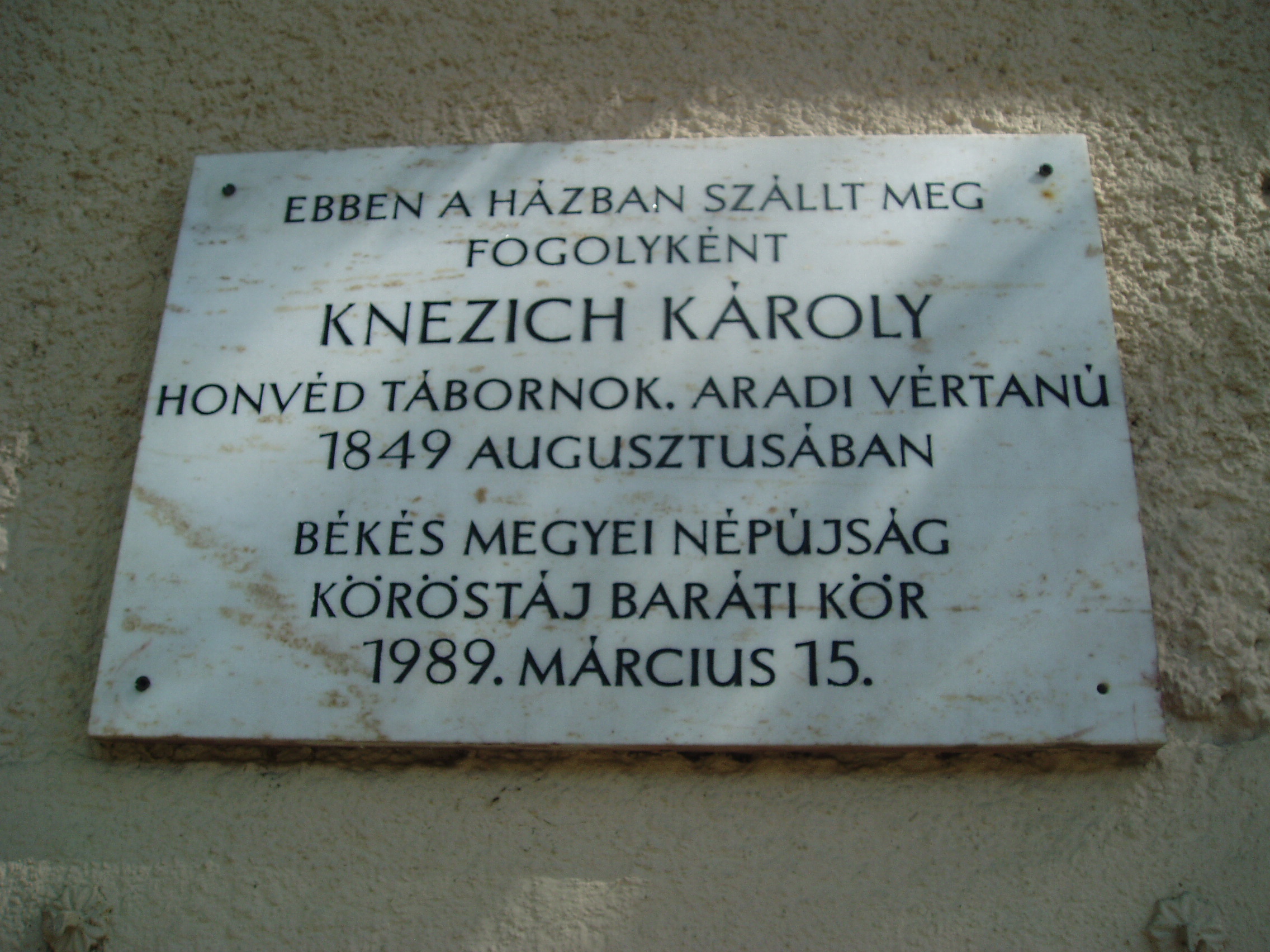 Nyilvános 995 | 1414 | Gyula, Jókai utca 8. Czégényi-ház | Ebben a házban volt elszállásolva 1849. augusztusában Knezich Károly honvéd tábornok, az aradi vértanúk egyike. A lefegyverzéskor kardját Czégényi nevű házigazdájának adta át, s ma a gyulai múzeum becses tulajdona. A szabadságharc tragikus gyulai eseményét lásd: Gyula, Várkert: Honvédtiszti emlékhely. A fénykép 2007 júliusában készült. Felh. irod.: Czeglédi Imre: Gyula útikalauz. 2. jav., bőv. kiad. Gyula, 1995 |
