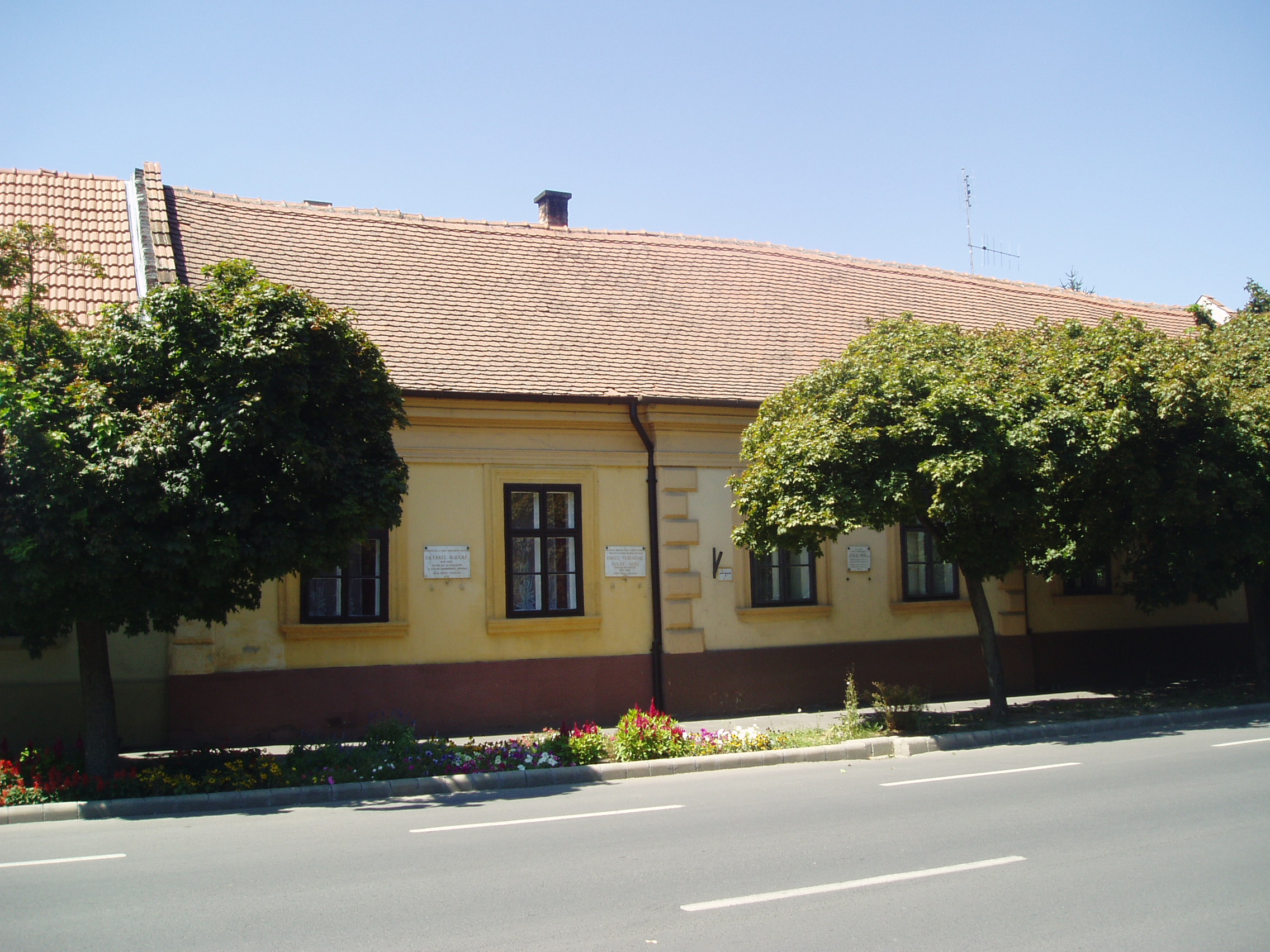 Nyilvános 1020 | 1562 | Gyula, Kossuth utca 30. | Az Almásy-kastélyhoz vezető kőhíddal egyvonalban, az utca túlsó oldalán álló földszintes lakóház egykor Erkel Rezső (Rudolf) vármegyei főorvos, Erkel Ferenc öccse lakása volt, ahol a zeneköltő is gyakran megfordult (János testvérük a szomszédban, a mai 28. szám alatt lakott). Jókai Mór két ízben is megfordult a házban. Először Laborfalvy Rózával 1848. augusztus 29-én kötött házasságuk után voltak a ház vendégei (Erkel Rezső korábban a Nemzeti Színház orvosa volt, onnét ismerték egymást). 1849 júliusában, a szabadságharc vége felé Jókai, Pestről elmenekülve az Erkel család vendégszeretetére bízta feleségét, akivel együtt volt a kor kiváló operaénekesnője, Schodelné Klein Róza is, akik a ház két udvari szobájában húzták meg magukat. Ide tért vissza Jókai feleségéért a világosi fegyverletétel után. Erről szól "Egy napom Gyulán" című szívszorító írása: "Ez volt életem legszomorúbb napja. 1849. augusztus 13-án nyitottam be a gyulai Erkel ház ajtaján ezzel a szóval: nincsen hazánk”. Jókai innét utazott álöltözetben, hamis papírokkal Tardonára. 1860-tól haláláig ebben a házban élt Erkel Ferencné Ádler Adél, miután különvált férjétől. Gyulán hunyt el, sírja a Szentháromság-temetőben van. Az épületen Erkel Rudolf, Ádler Adél és Jókai Mór emlékét márványtáblákon örökítették meg. A fénykép 2007 júliusában készült. Felh. irod.: Czeglédi Imre: Gyula útikalauz. 2. jav., bőv. kiad. Gyula, 1995 |