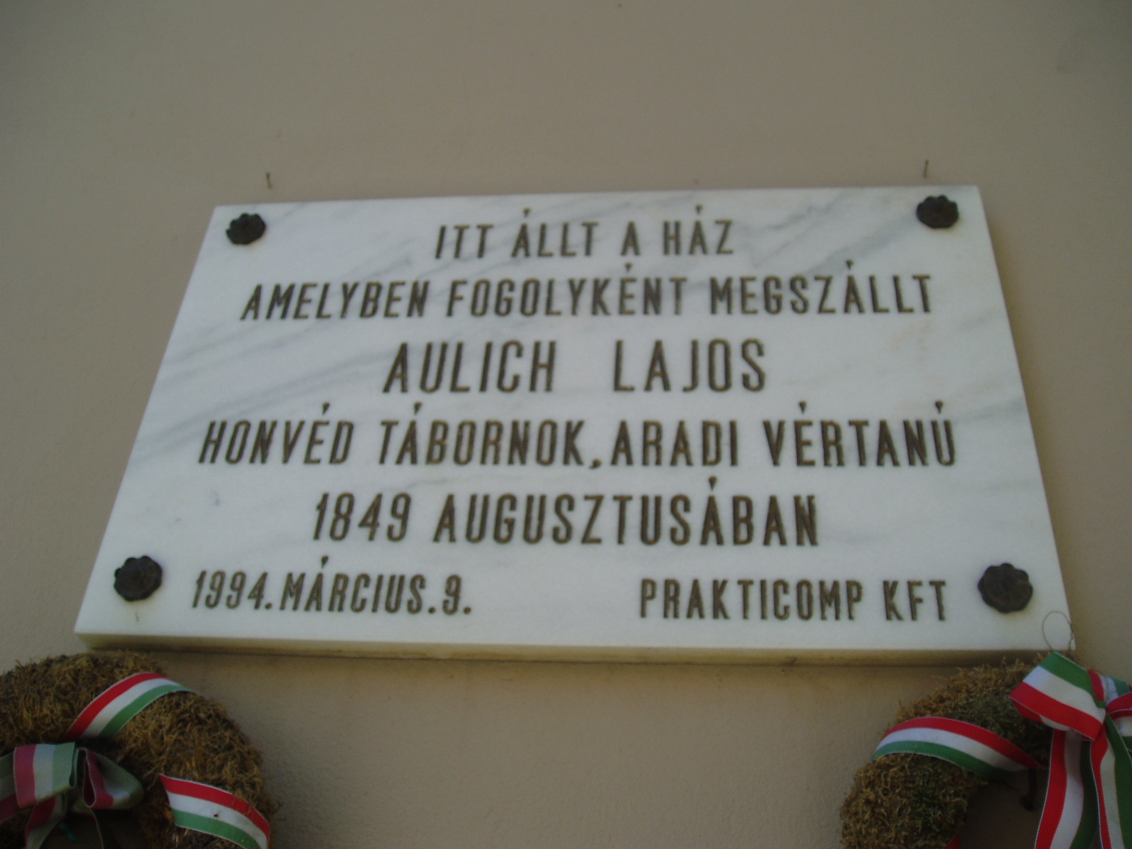 Nyilvános 1006 | 1463 | Gyula, Városház utca 23. | A lakóházat 1994-ben eredeti formájában építették újjá. 1849 augusztusában itt szállt meg Aulich Lajos honvéd tábornok. A szabadságharc tragikus gyulai eseményét lásd: Gyula, Várkert: Honvédtiszti emlékhely. A fénykép 2007 júliusában készült. Felh. irod.: Czeglédi Imre: Gyula útikalauz. 2. jav., bőv. kiad. Gyula, 1995 |