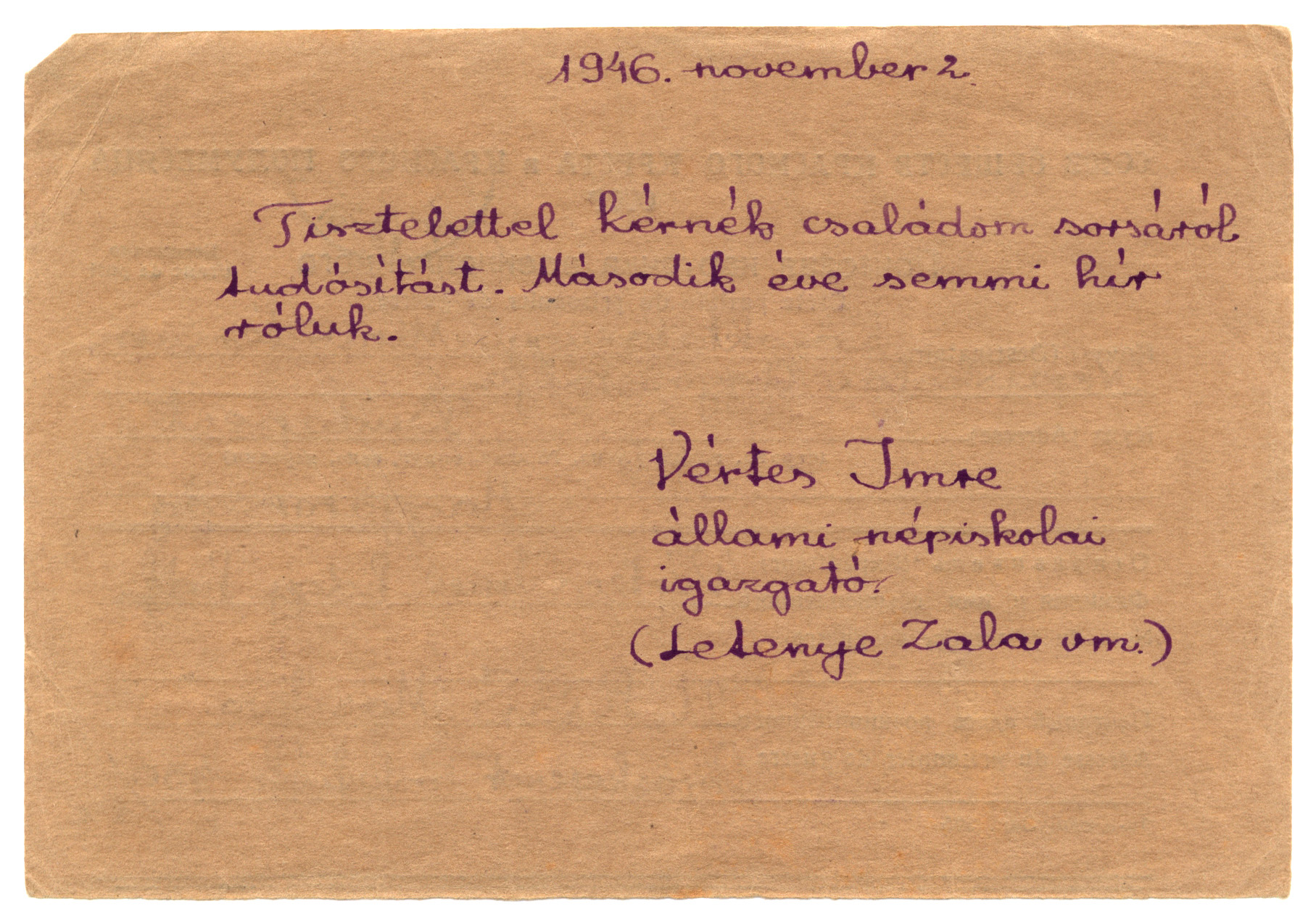 Nyilvános 1372 | 2514 | "Várj reám, én megjövök" - levelek a messzi távolból | Közoktatásügyi Minisztérium Népiskolai Ügyosztálya Budapest Magyarország Vértes Imre hdgy. hdf. U.R.S.S. "Moszkva" Vöröskereszt, Postafiók 430/1 c. 1946. november 2. Tisztelettel kérnék családom sorsáról tudósítást. Második éve semmi hír róluk. Vértes Imre állami népiskolai igazgató (Letenye, Zala vm.) |