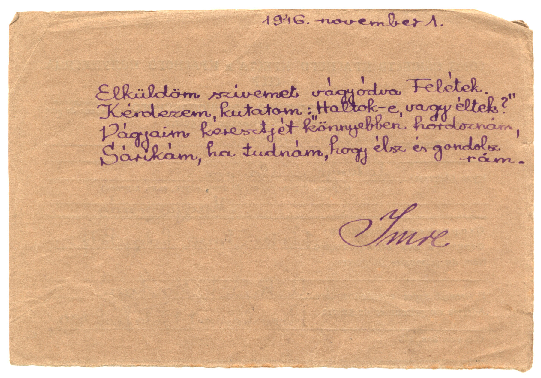 Nyilvános 1339 | 2462 | Vértes Imréné | Letenye Zala vm. Magyarország Vértes Imre hdgy. hdf. C.C.C.P. "Moszkva" Vöröskereszt, Postafiók 430/1. c. 1946. november 1. Elküldöm szívemet vágyódva Felétek. Kérdezem, kutatom: "Haltok-e, vagy éltek?" Vágyaim keresztjét könnyebben hordoznám, Sárikám, ha tudnám, hogy élsz és gondolsz rám. Imre |