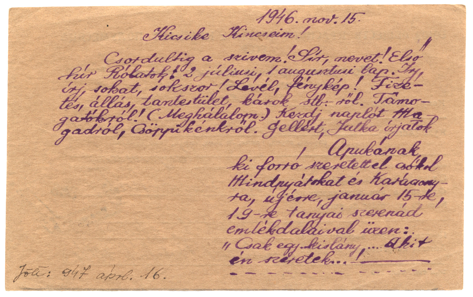 Nyilvános 1246 | 2413 | Vértes Imréné | Letenye IV. /Zala vm./ Magyarország Vértes Imre hdgy. U.R.S.S. "Moszkva" Vöröskereszt, Postafiók 430/1. c. 1946. nov. 15. Kicsike Kincseim! Csordultig a szívem! Sír, nevet! Első hír Rólatok: 2 júliusi, 1 augusztusi lap. Írj, írj sokat, sokszor! Levél, fénykép! Fizetés, állás, tantestület, káros stb.-ről. Támogatókról! (Meghálálom.) Kezdj naplót Magadról, Csöppikénkről. Gellért, Jutka írjatok Apukának ki forró szeretettel csókol Mindnyátokat és Karácsonyra, újévre, január 15-re, 19-re tanyai szerenád emlékdalaival üzen: "Csak egy kislány, ... akit én szeretek...!" Jött: 1947 áprl. 16. |