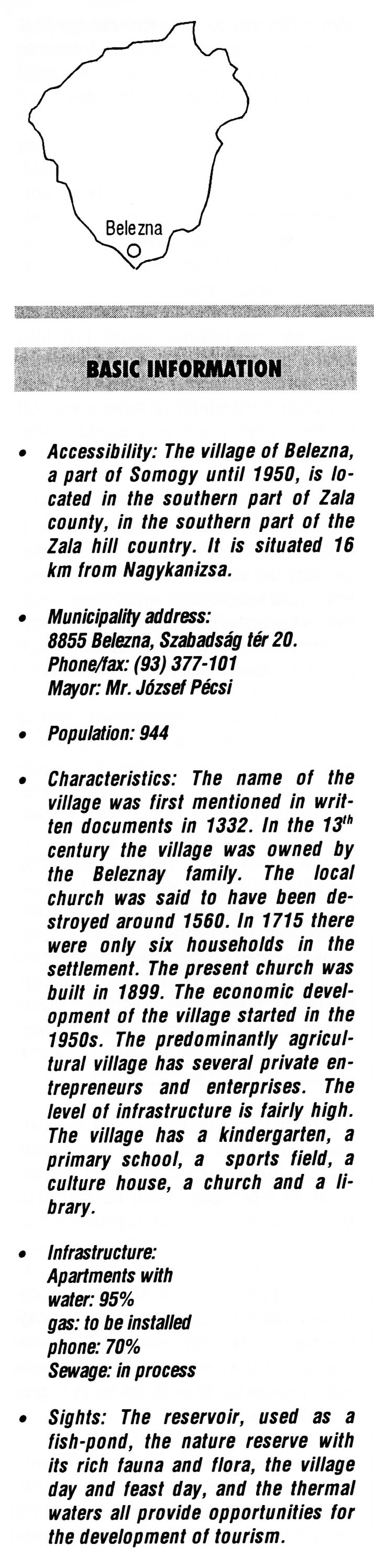 Nyilvános 2116 | 6416 | Belezna | BASIC INFORMATION • Accessibility: The village of Belezna, a part of Somogy until 1950, is located in the southern part of Zala county, in the southern part of the Zala hill country. It is situated 16 km from Nagykanizsa. • Municipality address: 8855 Belezna, Szabadság tér 20. Phone/fax: (93) 377-101 Mayor: Mr. József Pécsi • Population: 944 • Characteristics: The name of the village was first mentioned in written documents in 1332. In the 13th century the village was owned by the Beleznay family. The local church was said to have been destroyed around 1560. In 1715 there were only six households in the settlement. The present church was built in 1899. The economic development of the village started in the 1950s. The predominantly agricultural village has several private entrepreneurs and enterprises. The level of infrastructure is fairly high. The village has a kindergarten, a primary school, a sports field, a culture house, a church and a library. • Infrastructure: Apartments with water: 95% gas: to be installed phone: 70% Sewage: in process • Sights: The reservoir, used as a fish-pond, the nature reserve with its rich fauna and flora, the village day and feast day, and the thermal waters all provide opportunities for the development of tourism. This text came from the following book: Title: Handbook of Zala county (Zala megye kézikönyve) Series: County handbooks of Hungary (Magyarország megyei kézikönyvei) Chief editor: Hóbor József Publisher: (Hatvan), CEBA-Hungary Ltd, 1998 ETO: 908.439.121(035) ; 050.8(439.121) ISBN: 963-9089-18-2 Pages: 488-1040 p. Remark: Closed on: 1998. márc. 31. |